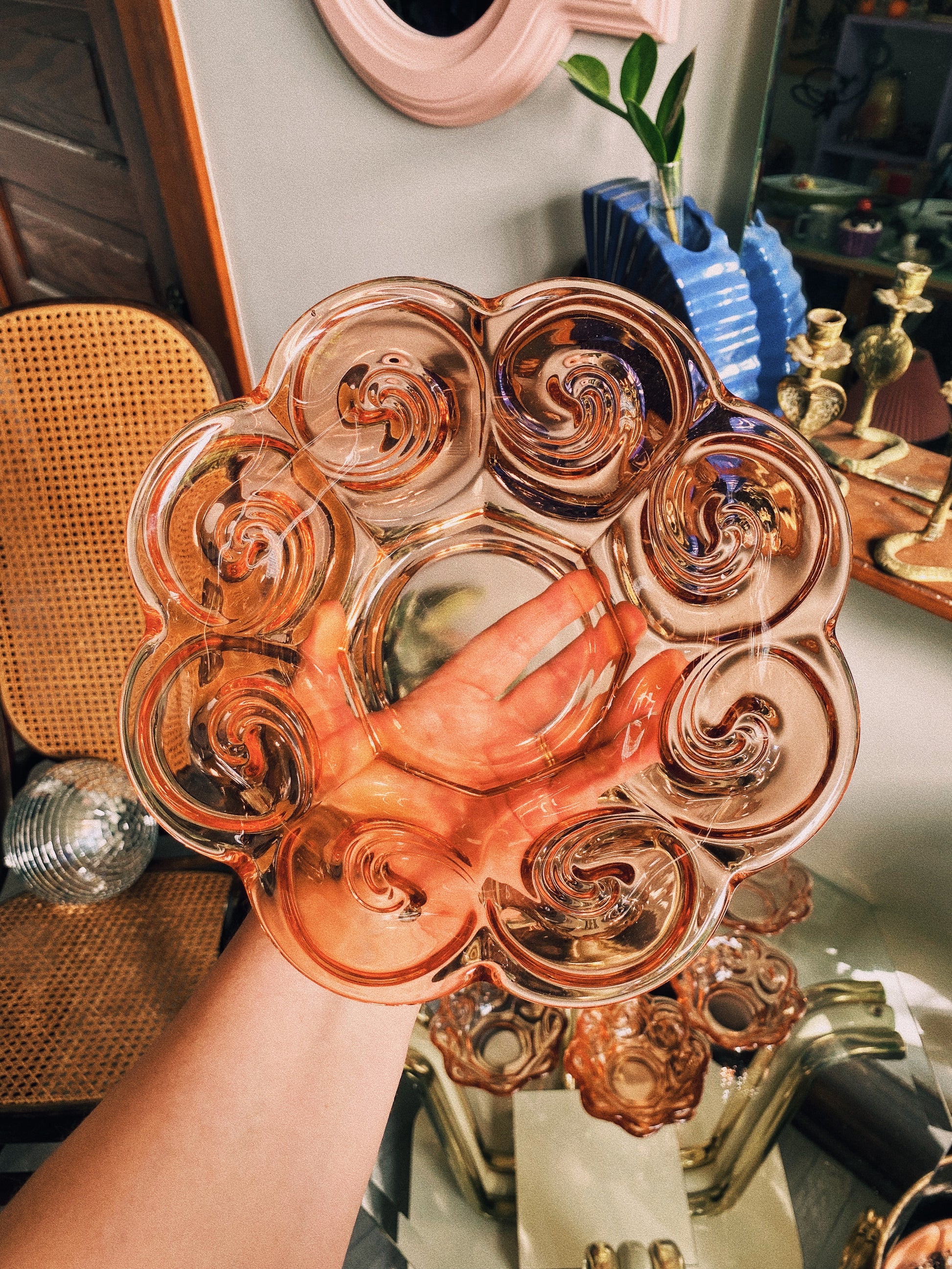Beautiful vintage swirly design pink glass large serving bowl with 6 small bowls that match.