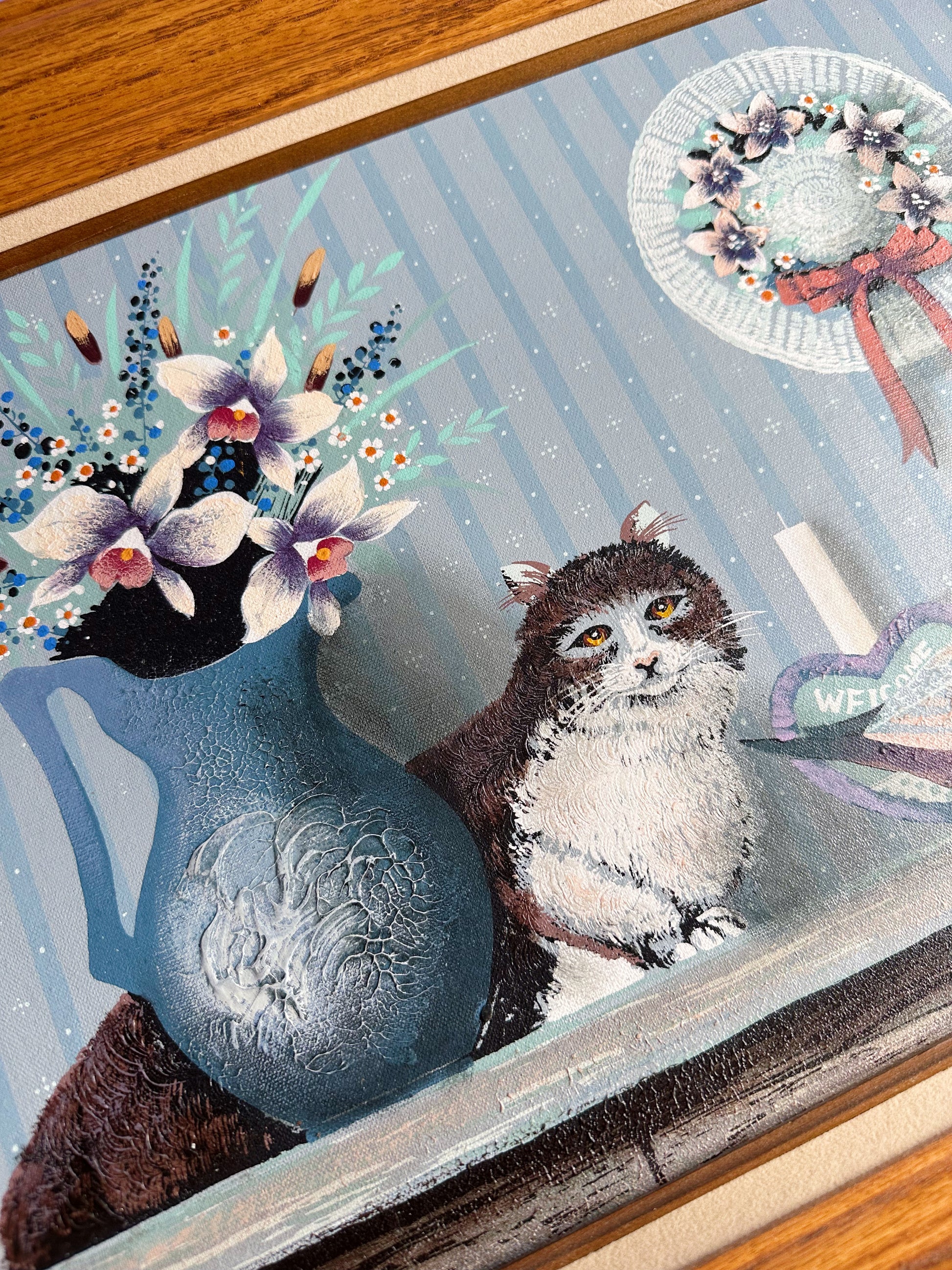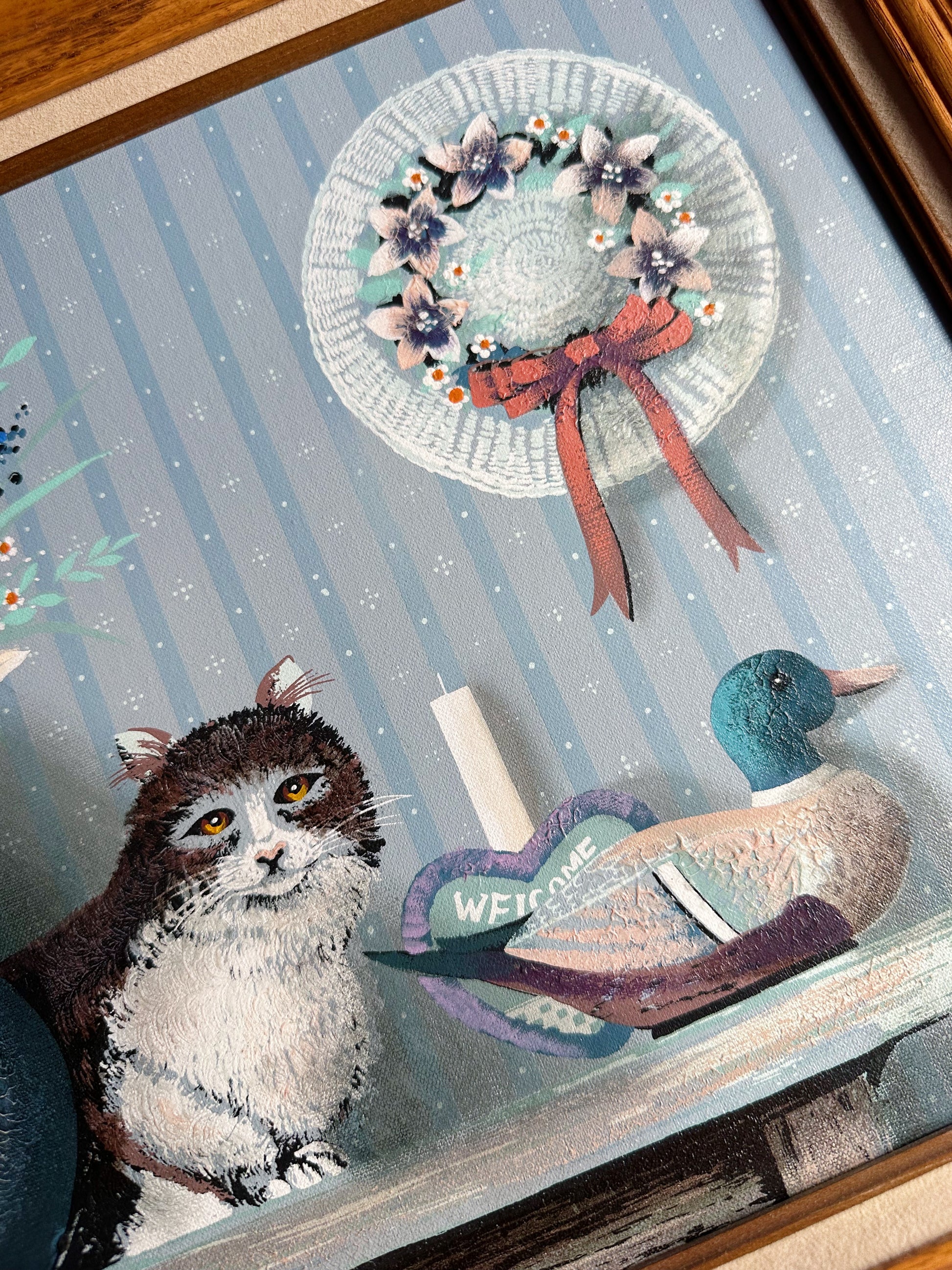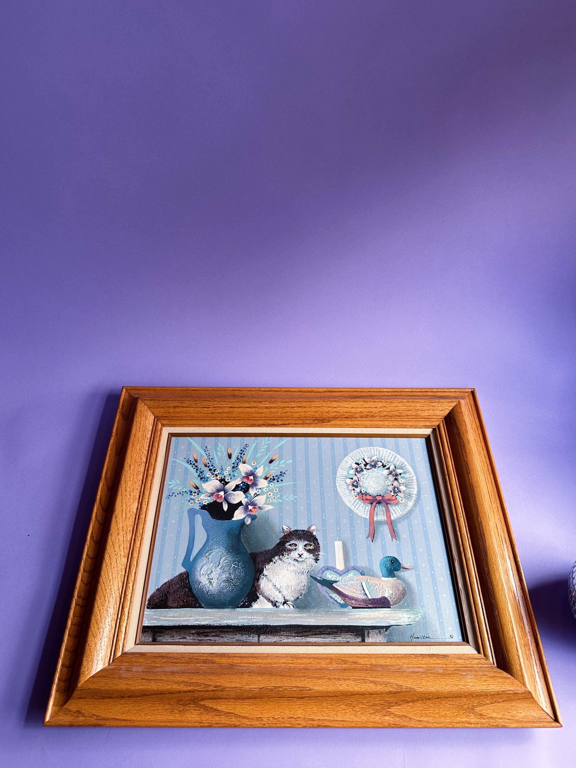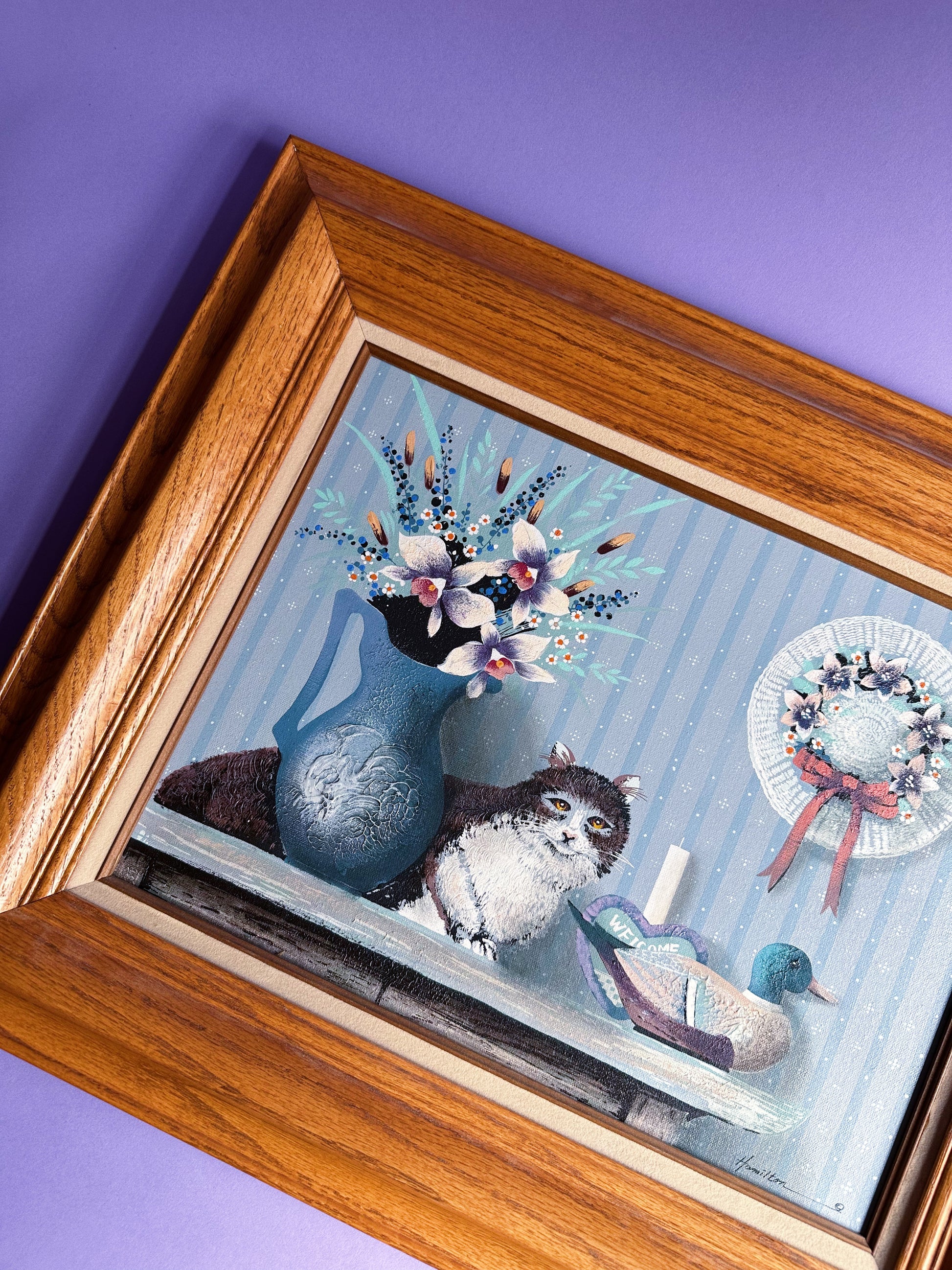 Framed Hamilton Cat & Duck Decoy Oil Painting Folk Country, Cabin Farm House