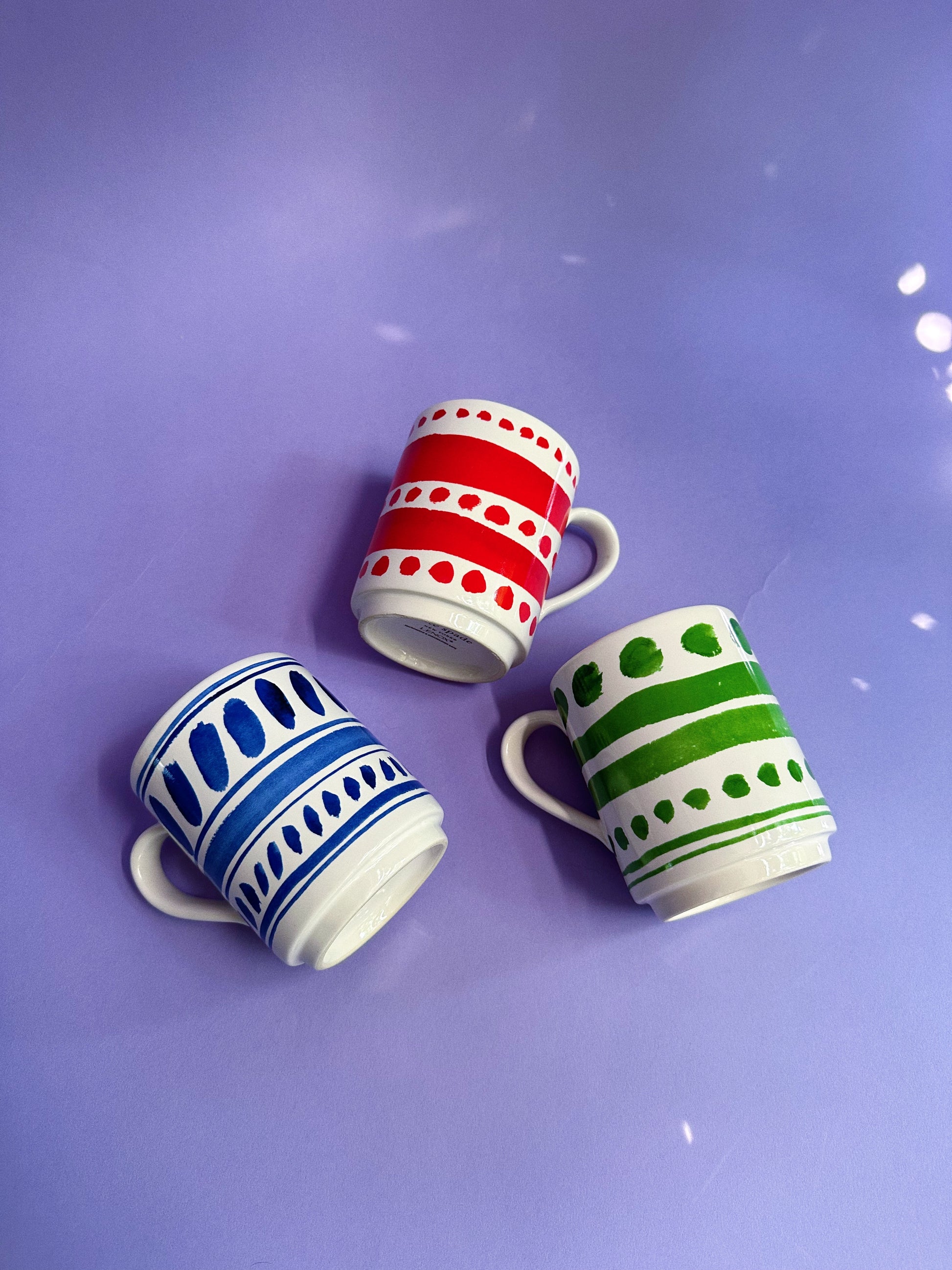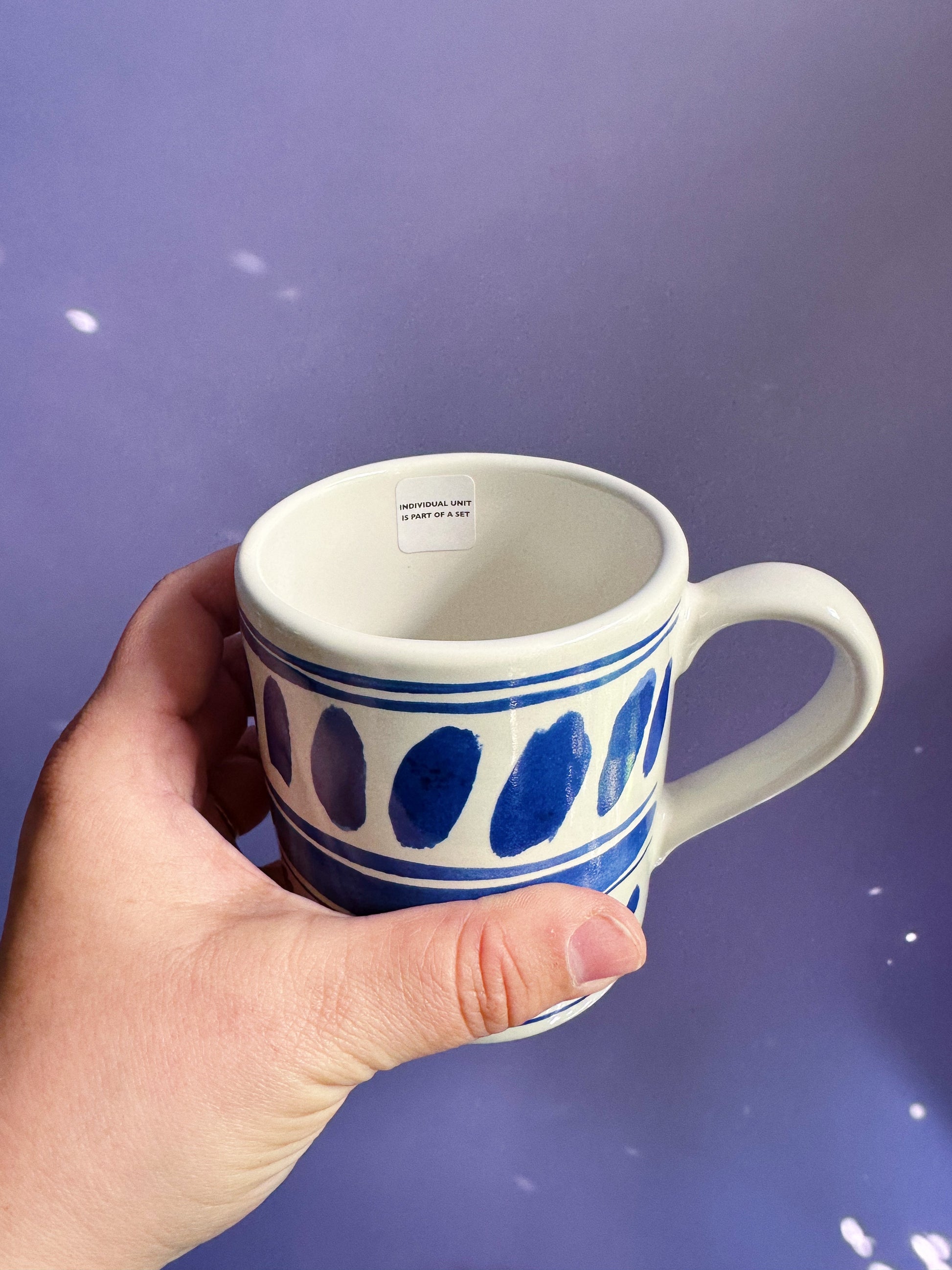Unused, not in box. 3 of 4 mugs, no pink version that usually comes in this set of 4.