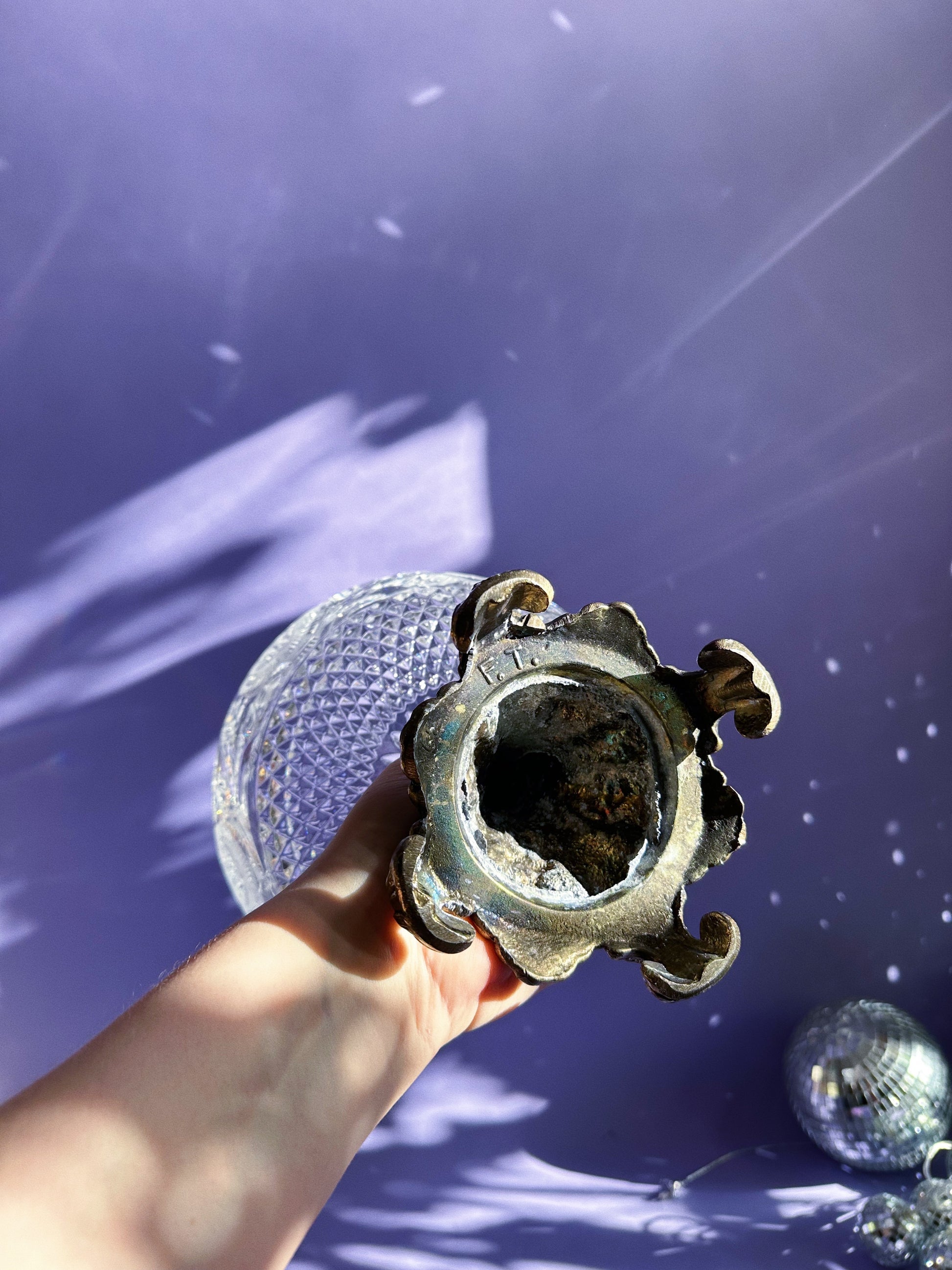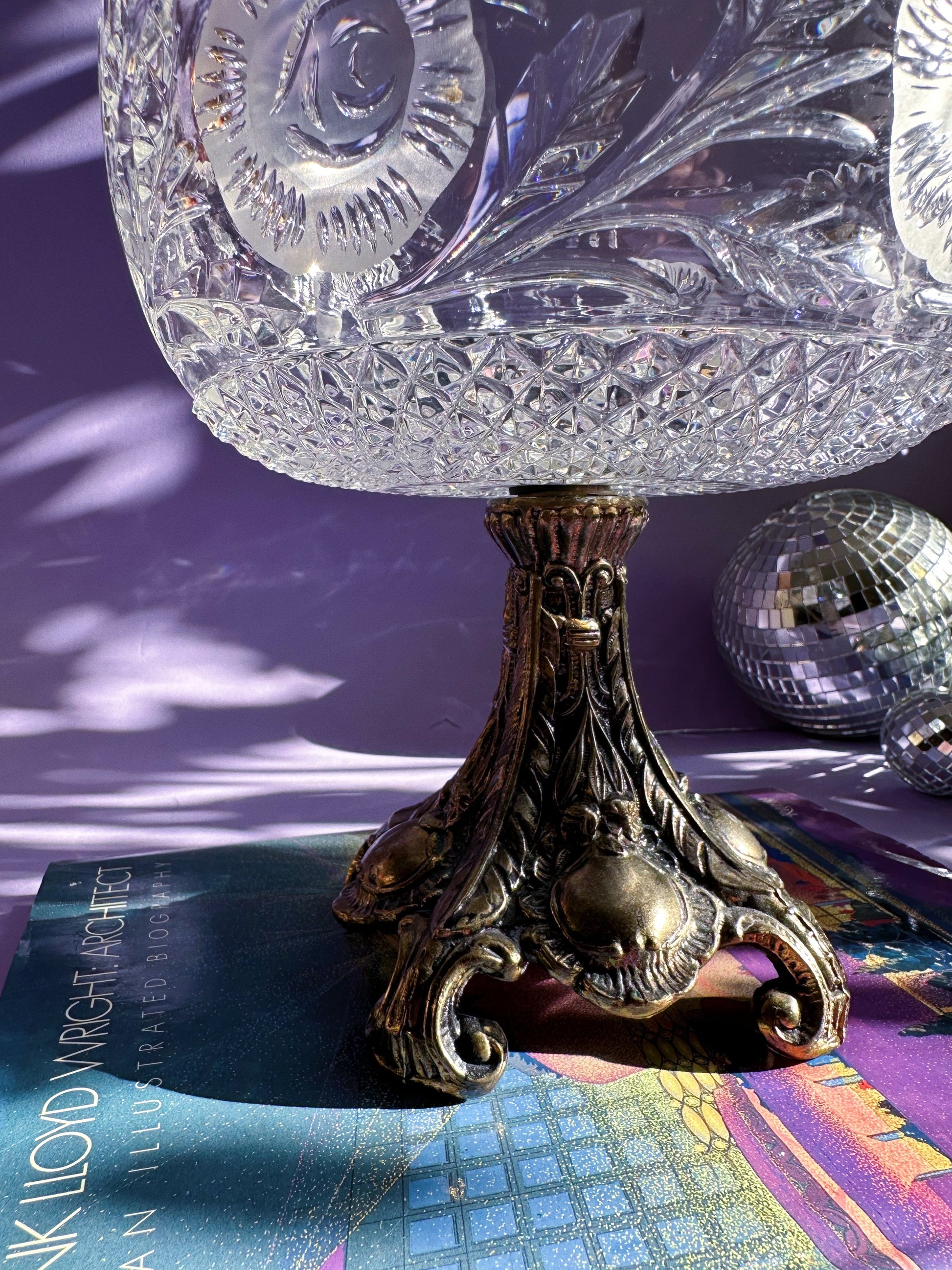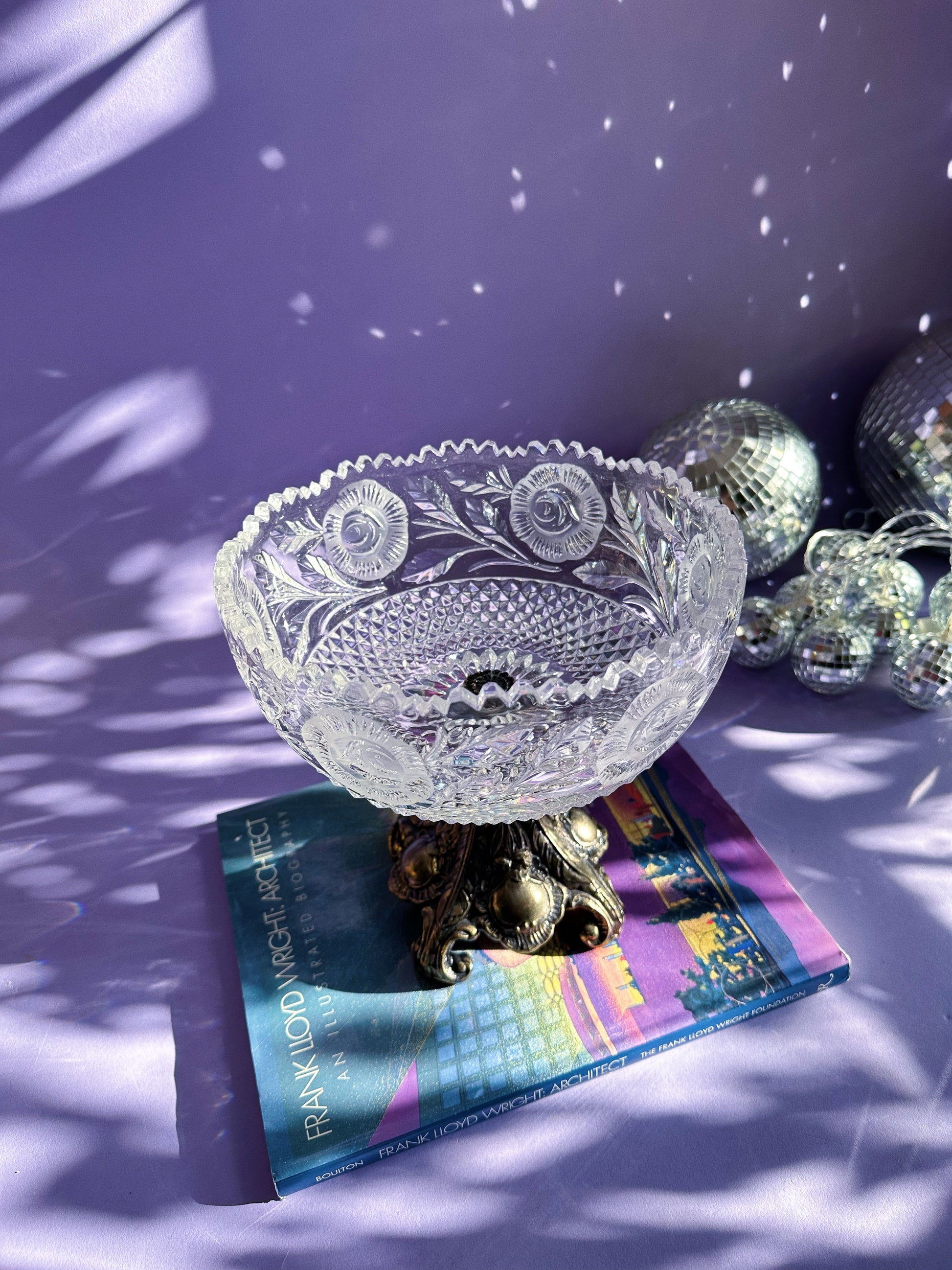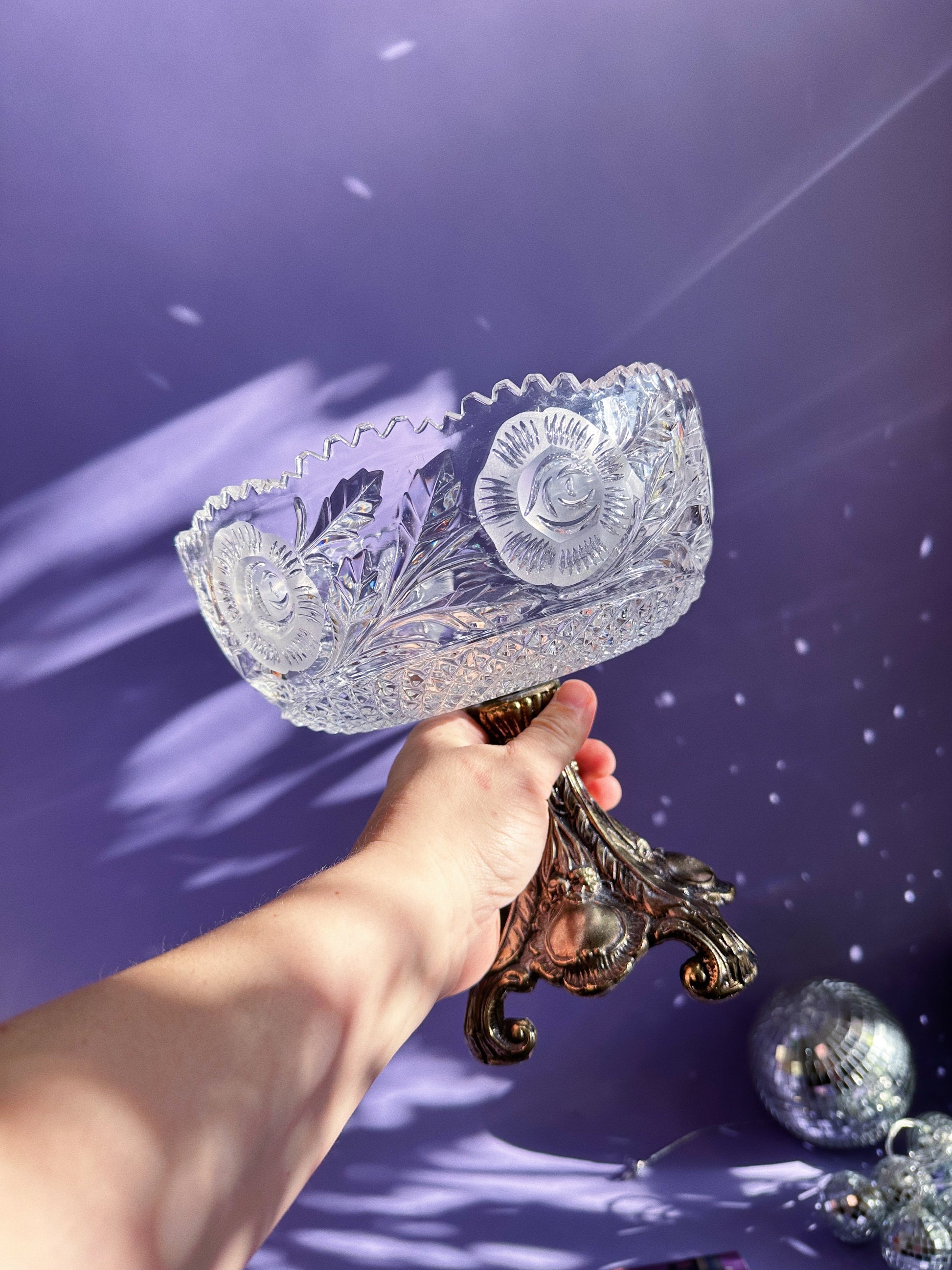 Mid Century Filigree Starburst Glass Compote Dish Metal Base Hollywood Regency