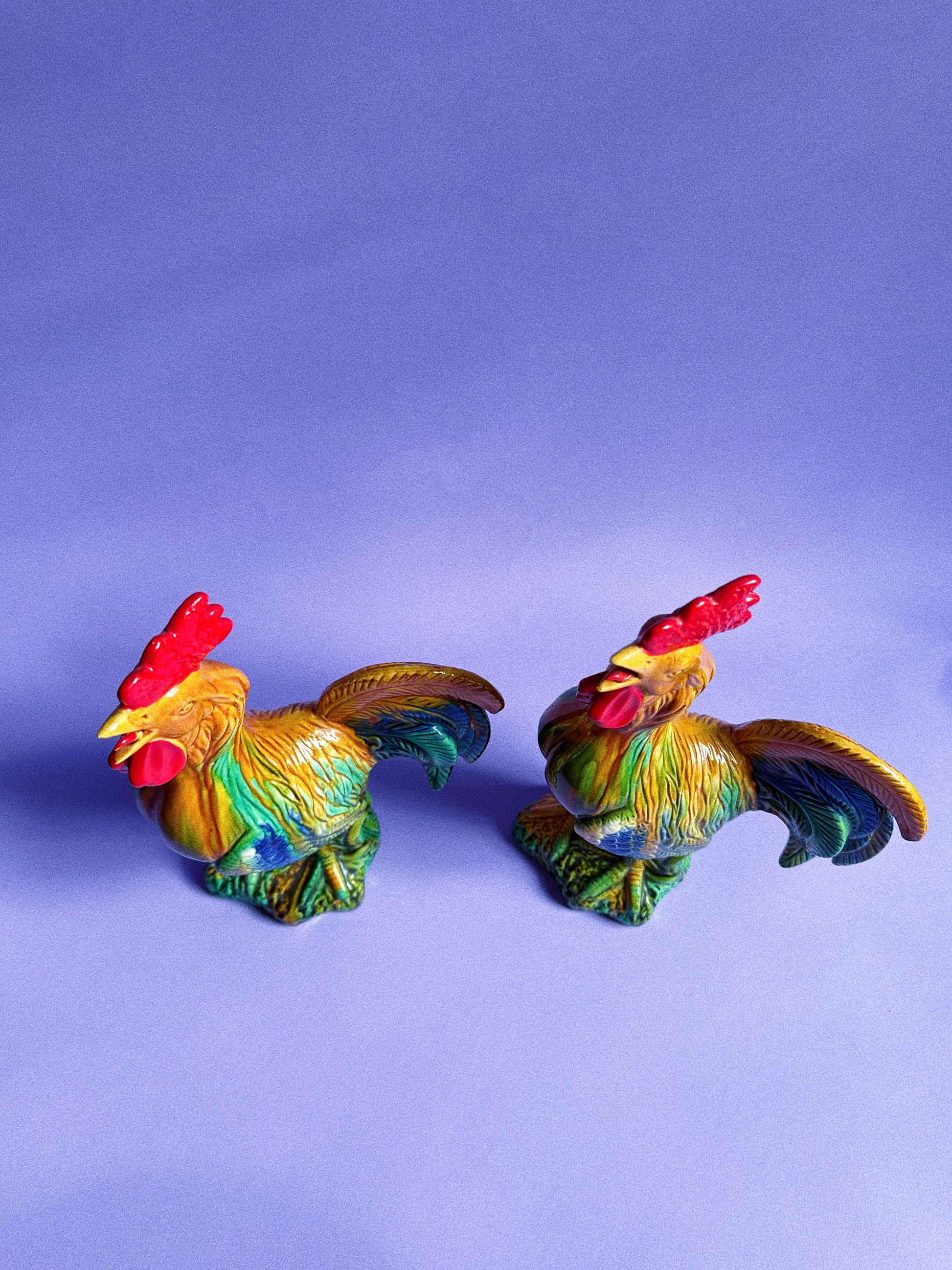 Pair Of 12” Majolica Glazed Bright colourful Ceramic Roosters