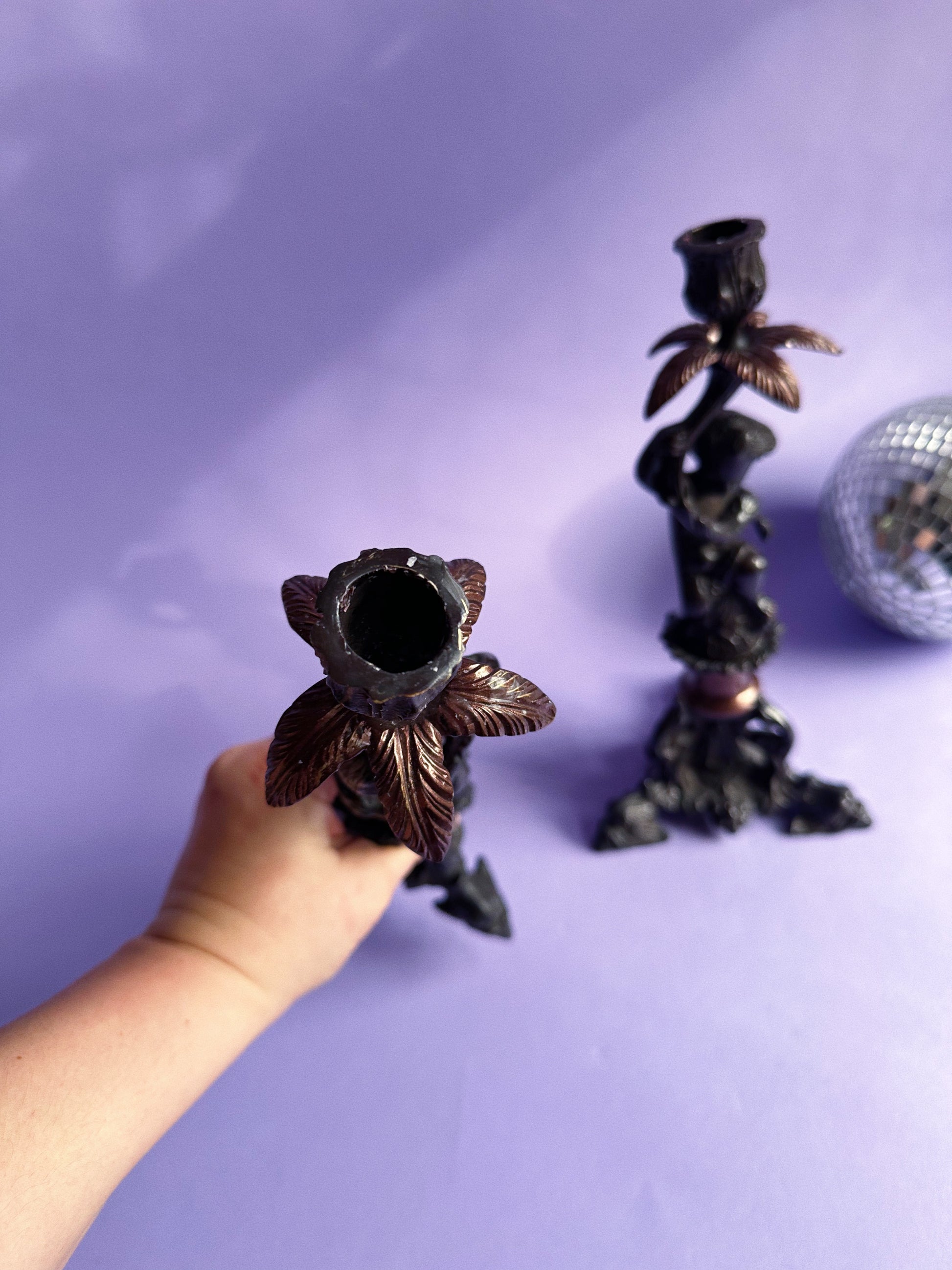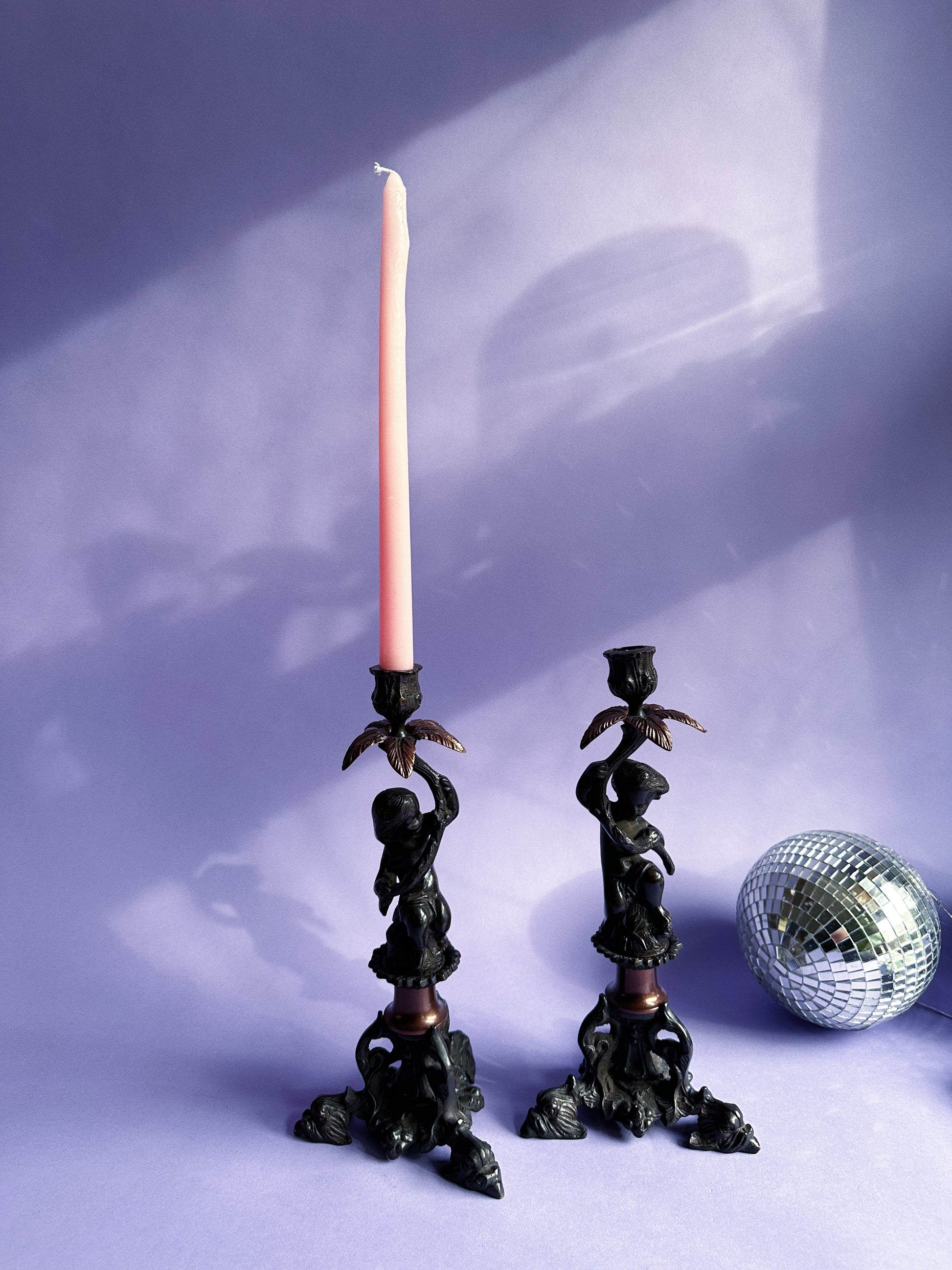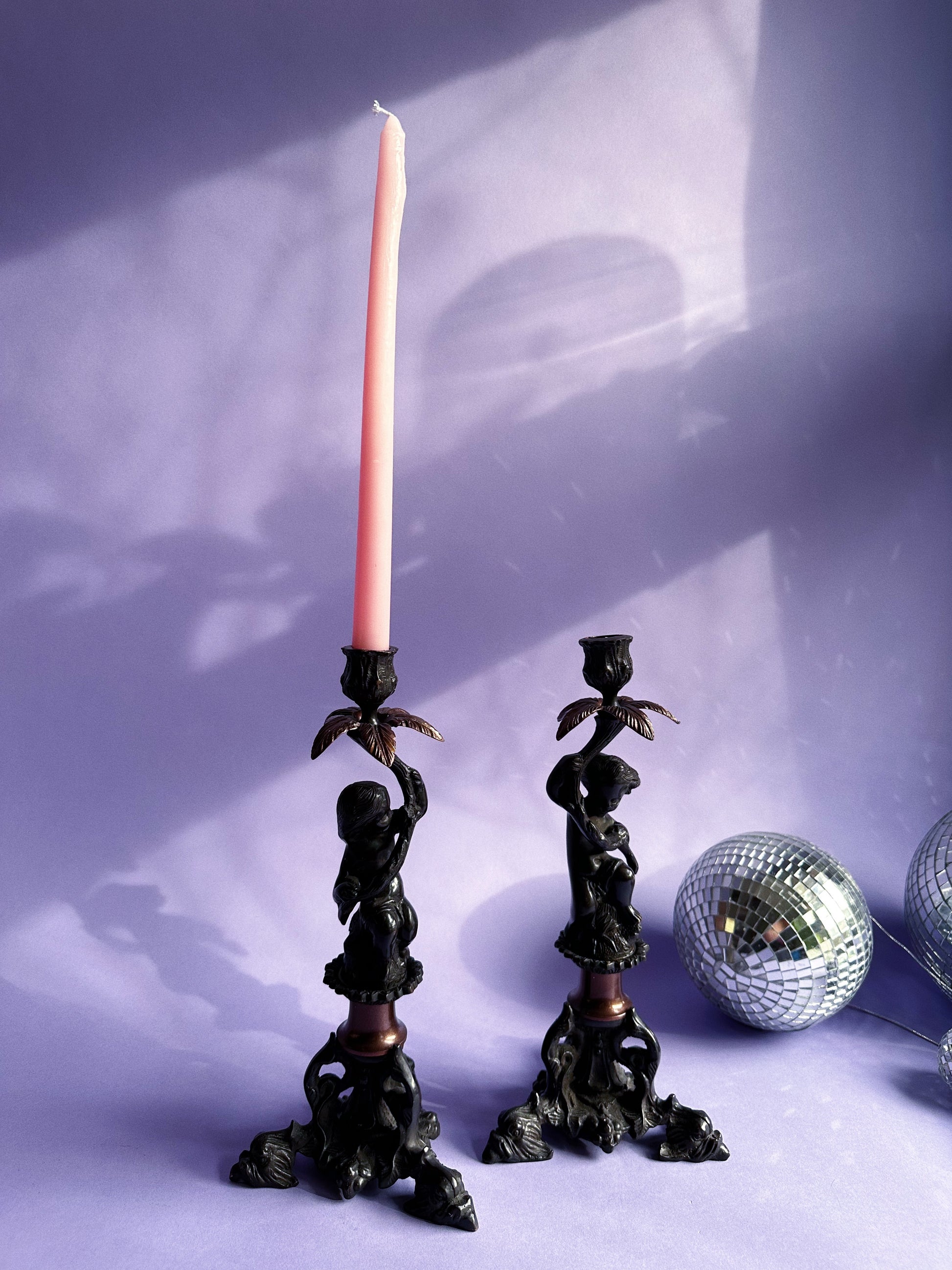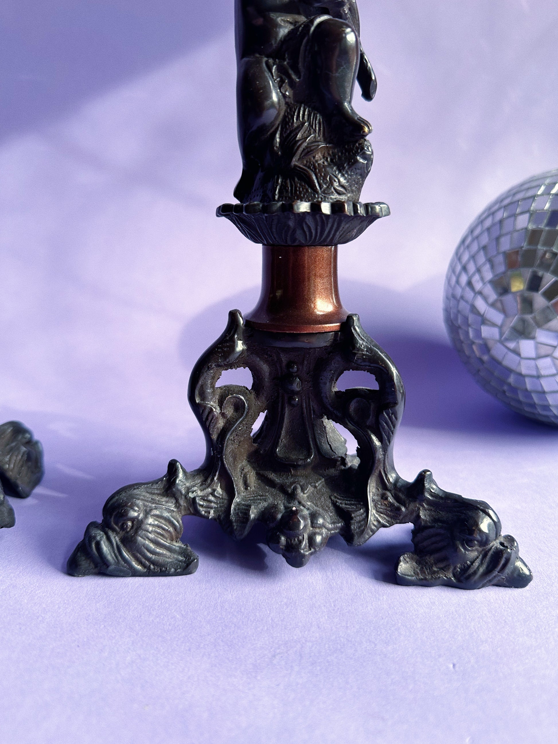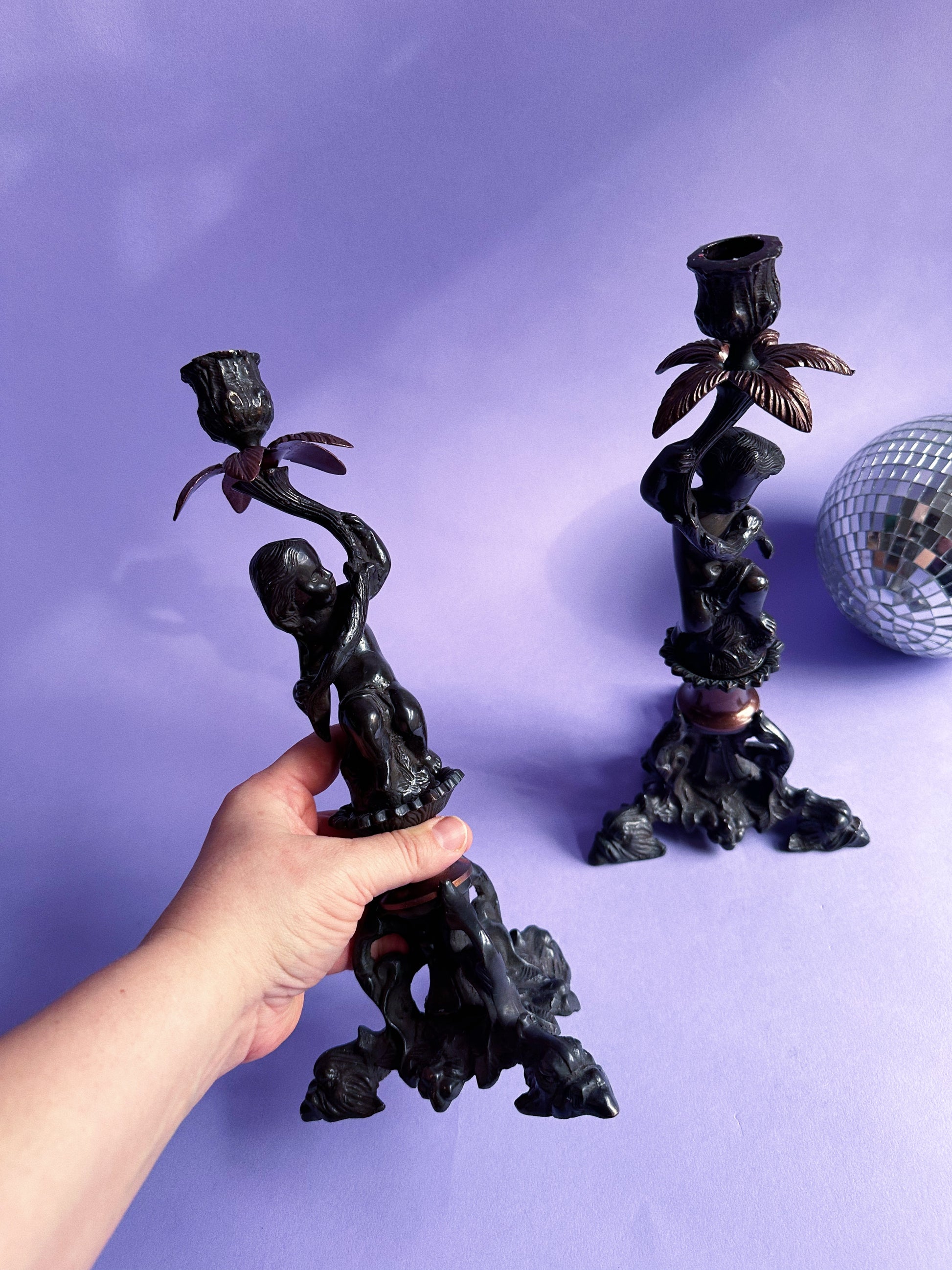 Pair Of Vintage Antique Heavy Cast Metal Cherub Candlesticks