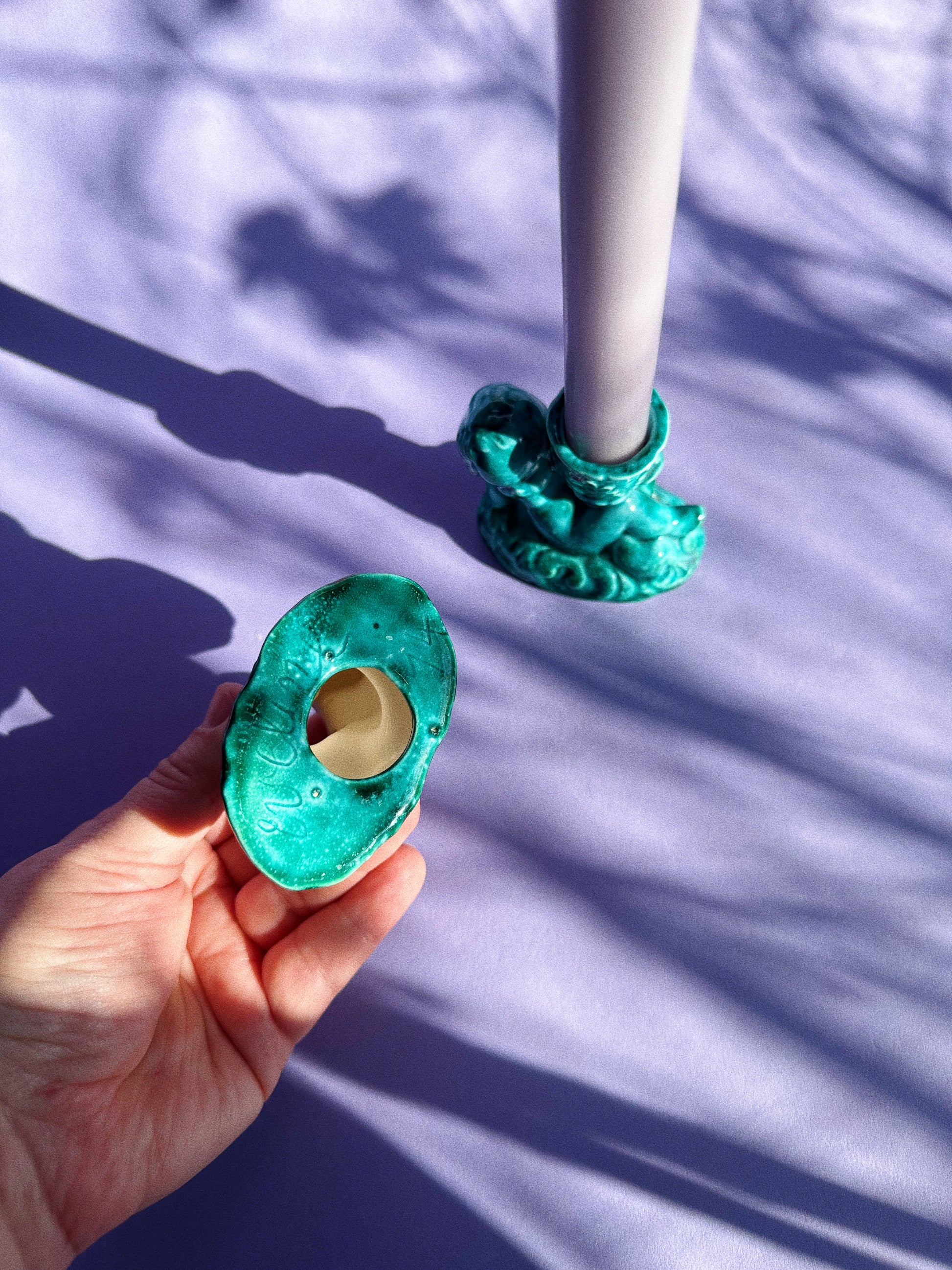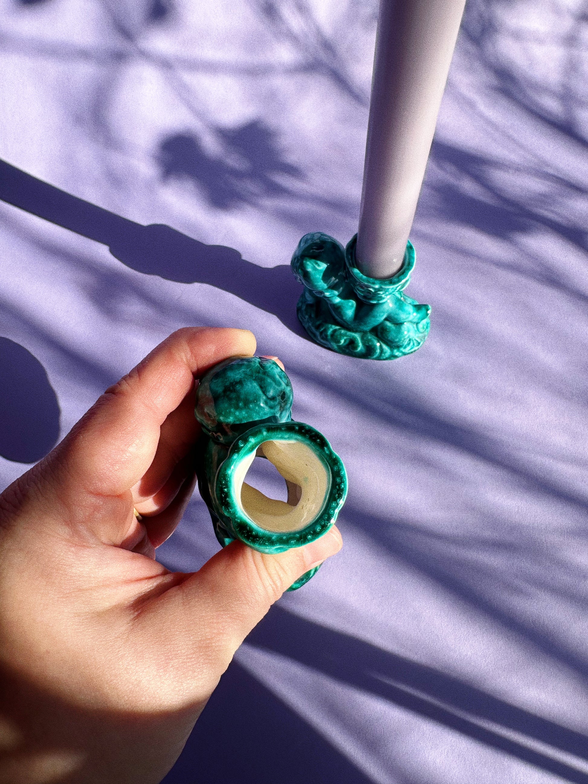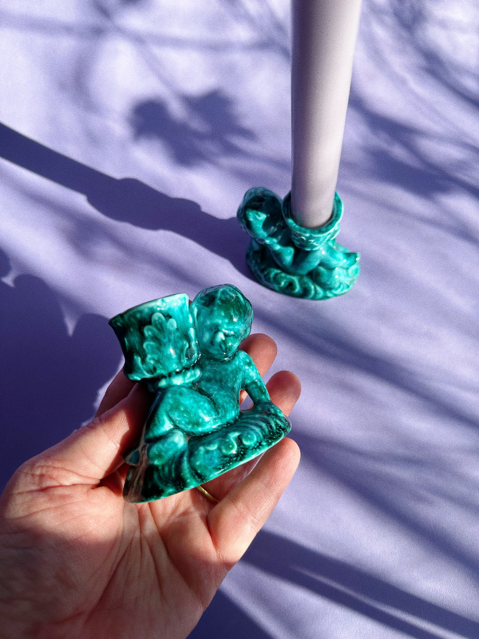 pair of glazed ceramic cherub candlesticks