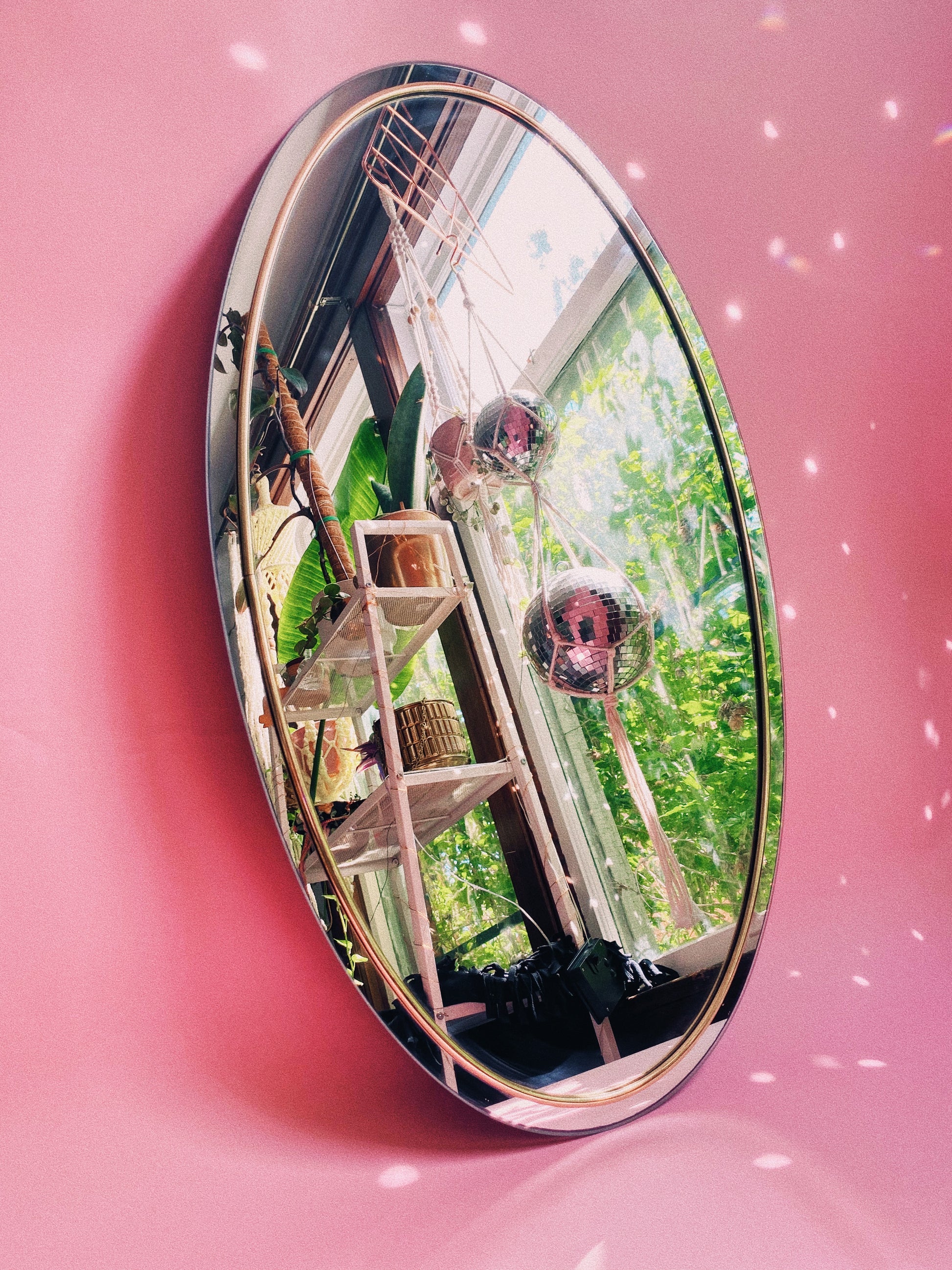 Beautiful oval post modern brass lined mirror.