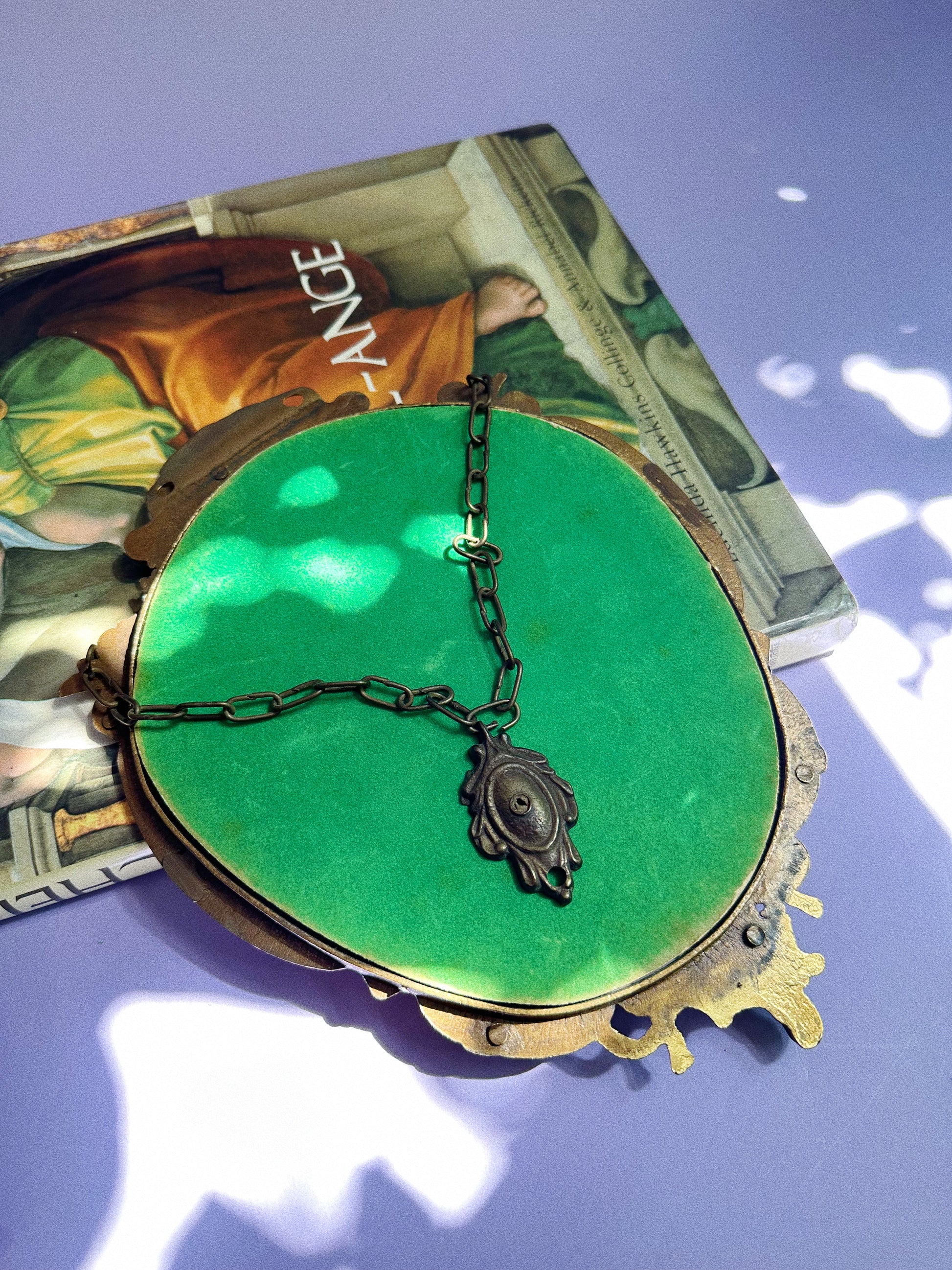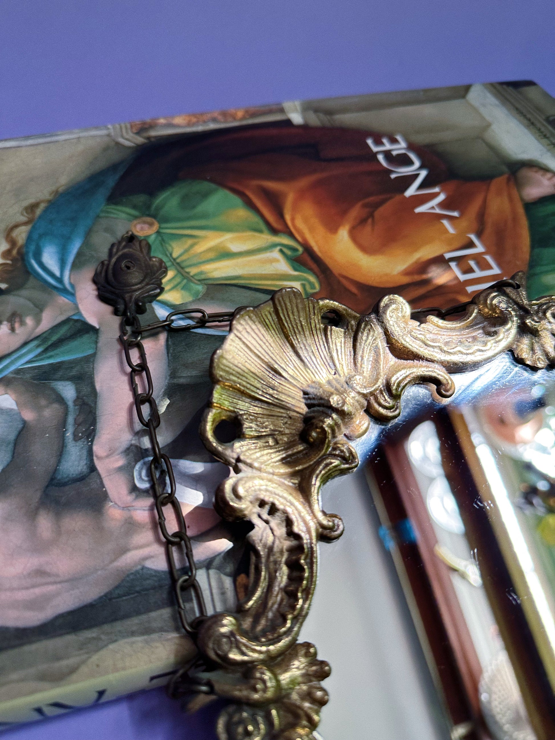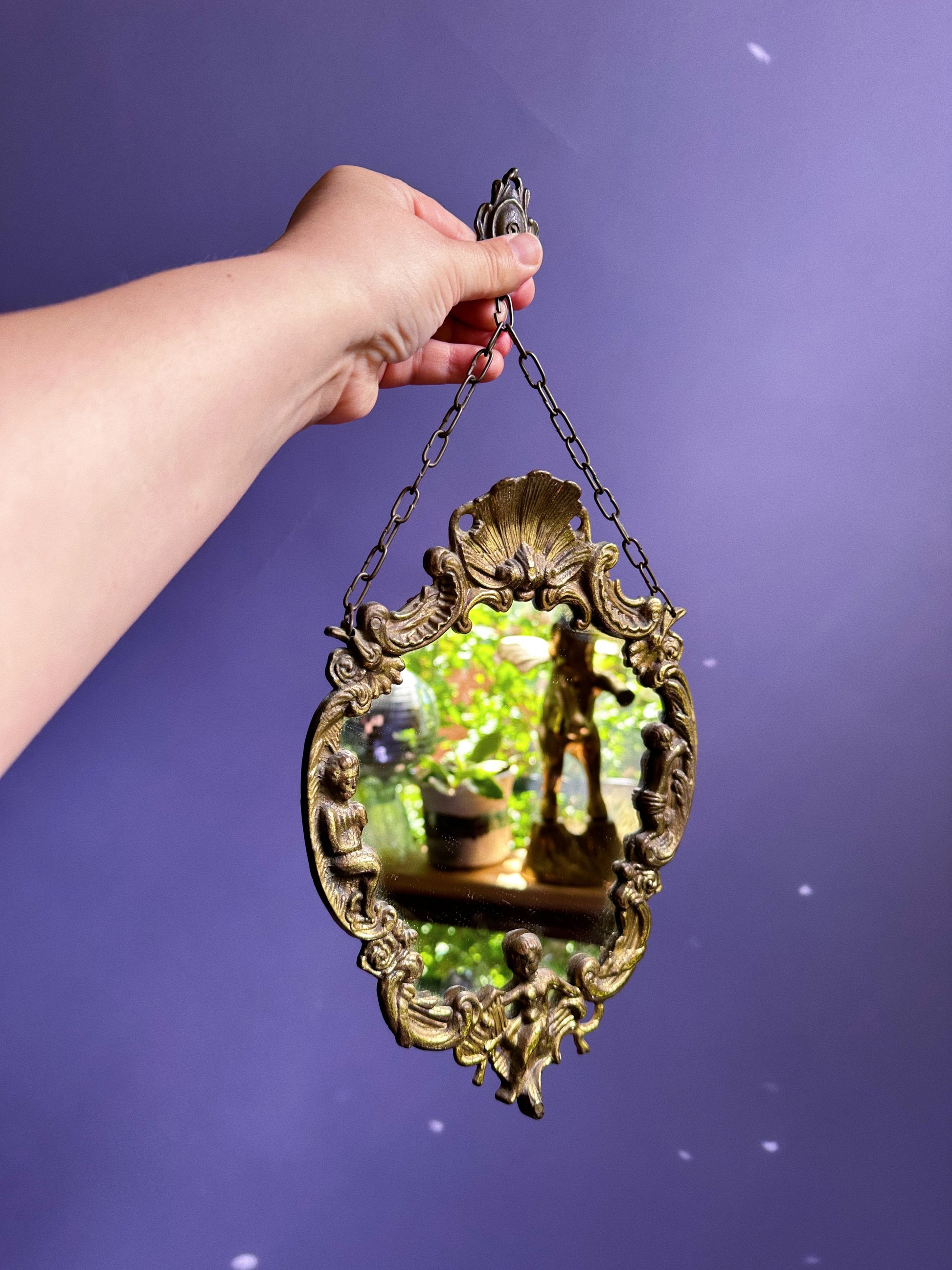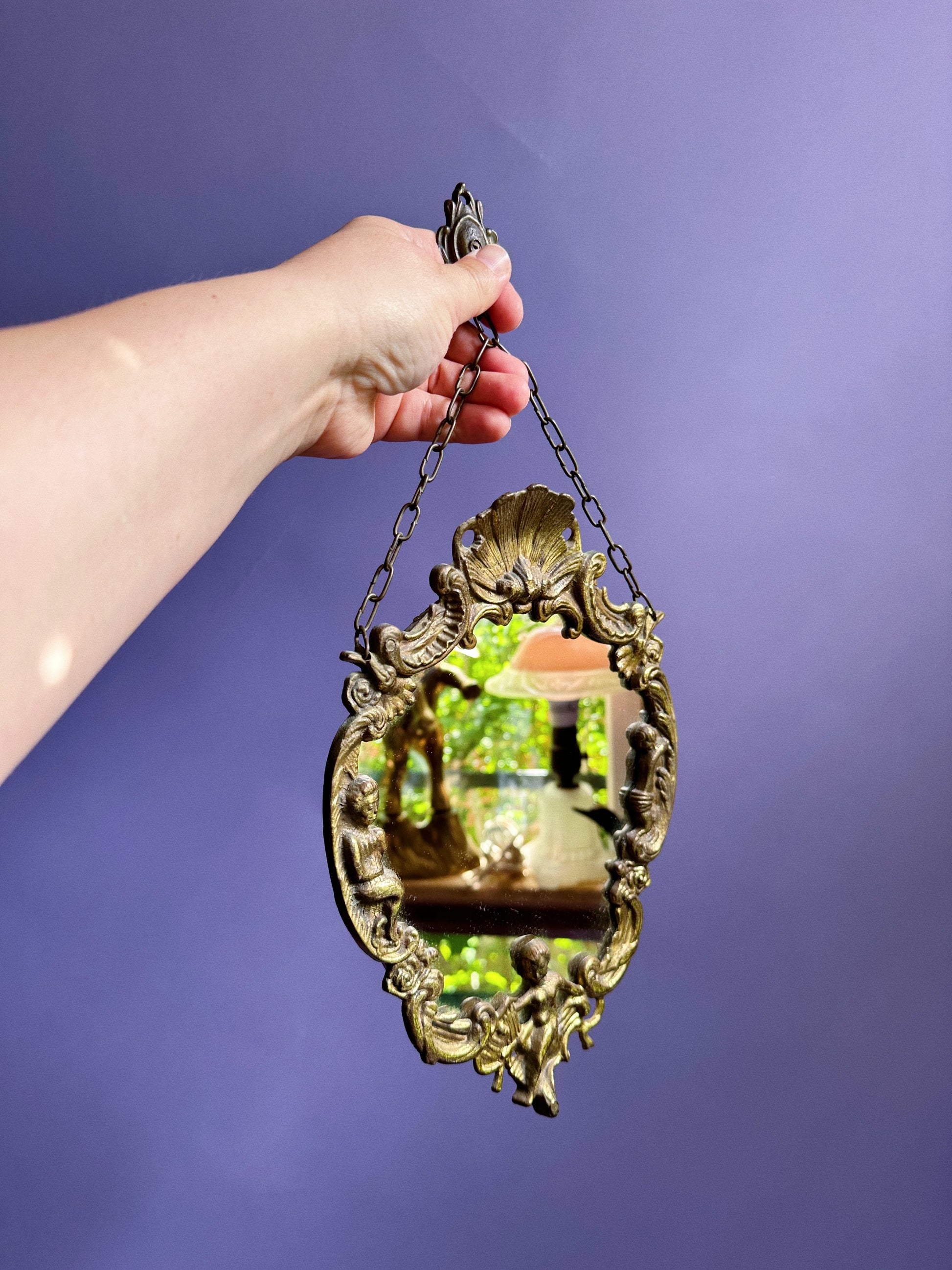 Antique Rococo Oval Mirror Gilt Floral Frame Cherub Shell Crest Brass Wall Decor