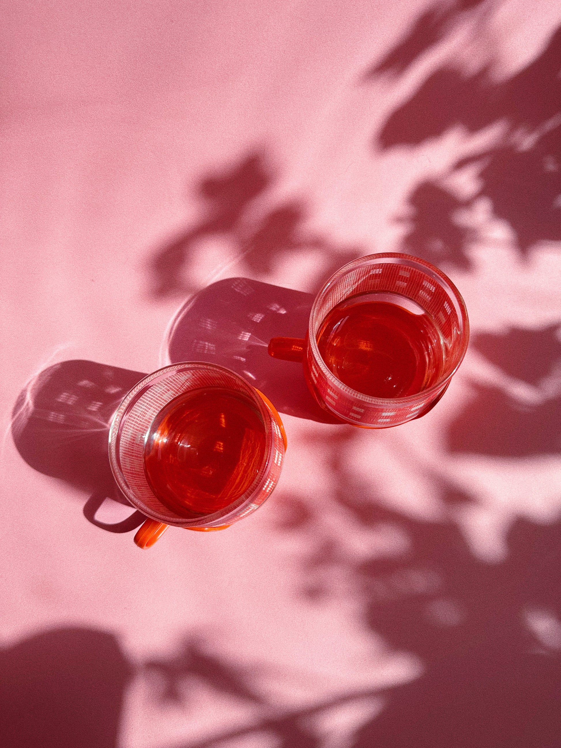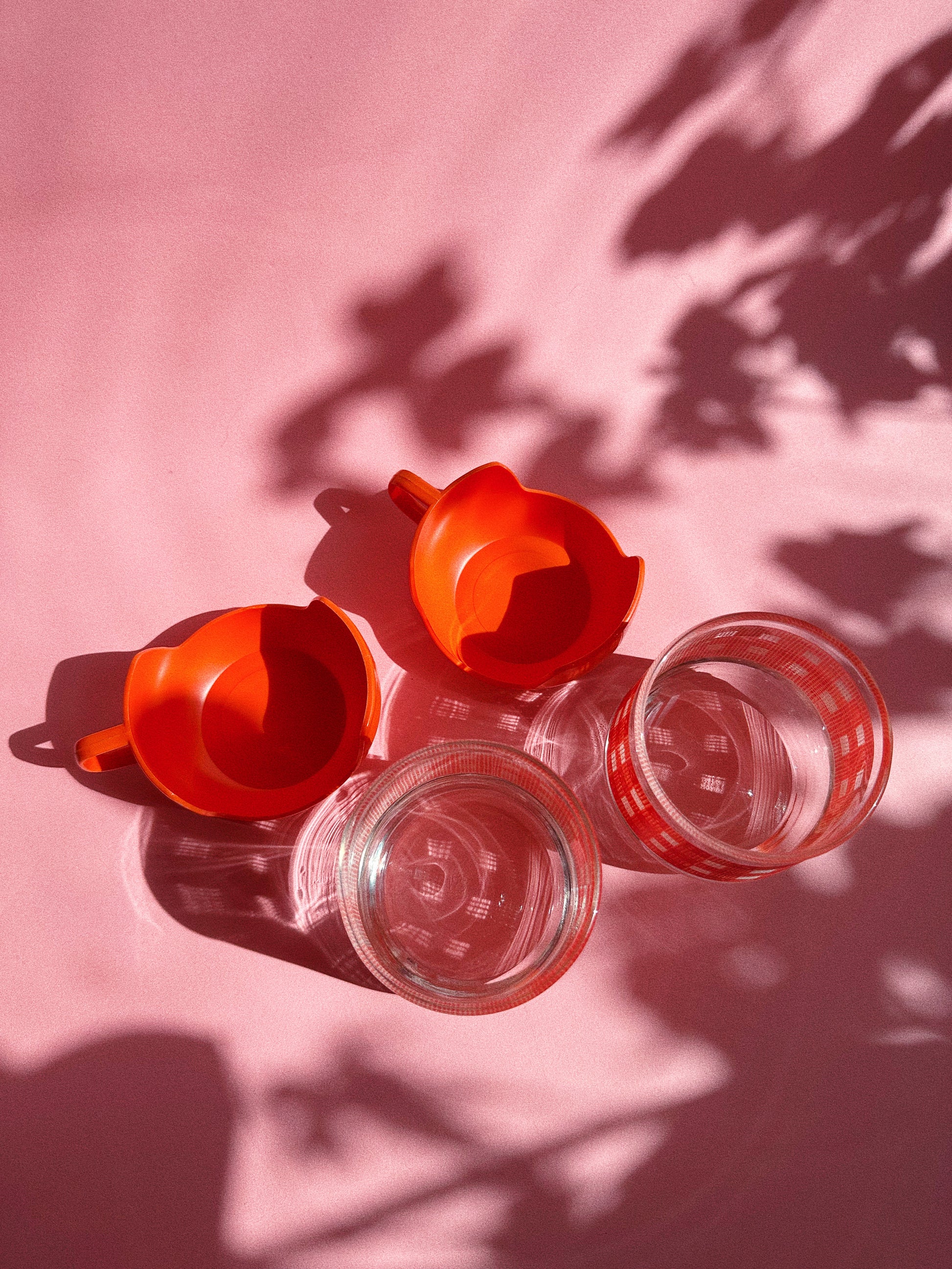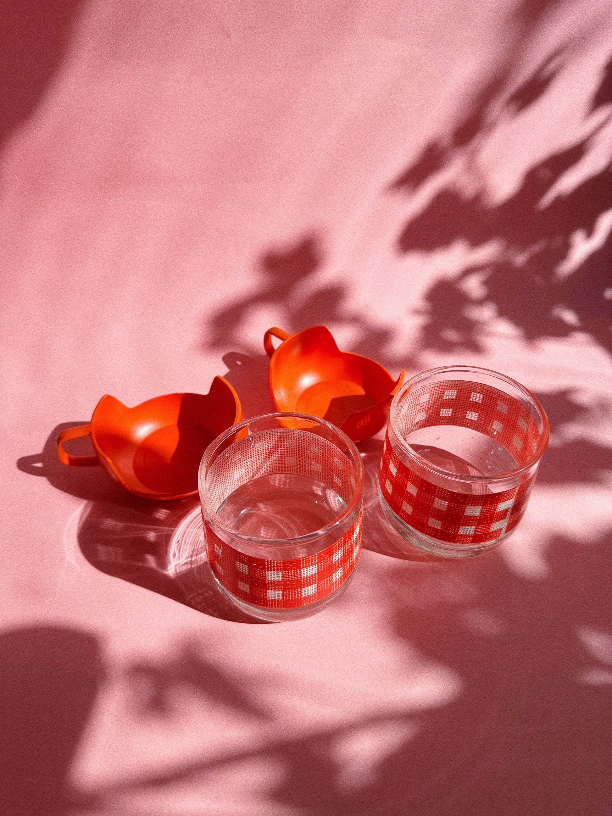 Vintage 1960s / 70s gingham Libbey short glass tumblers with plastic handle detachable bases. Easy to clip on and off.