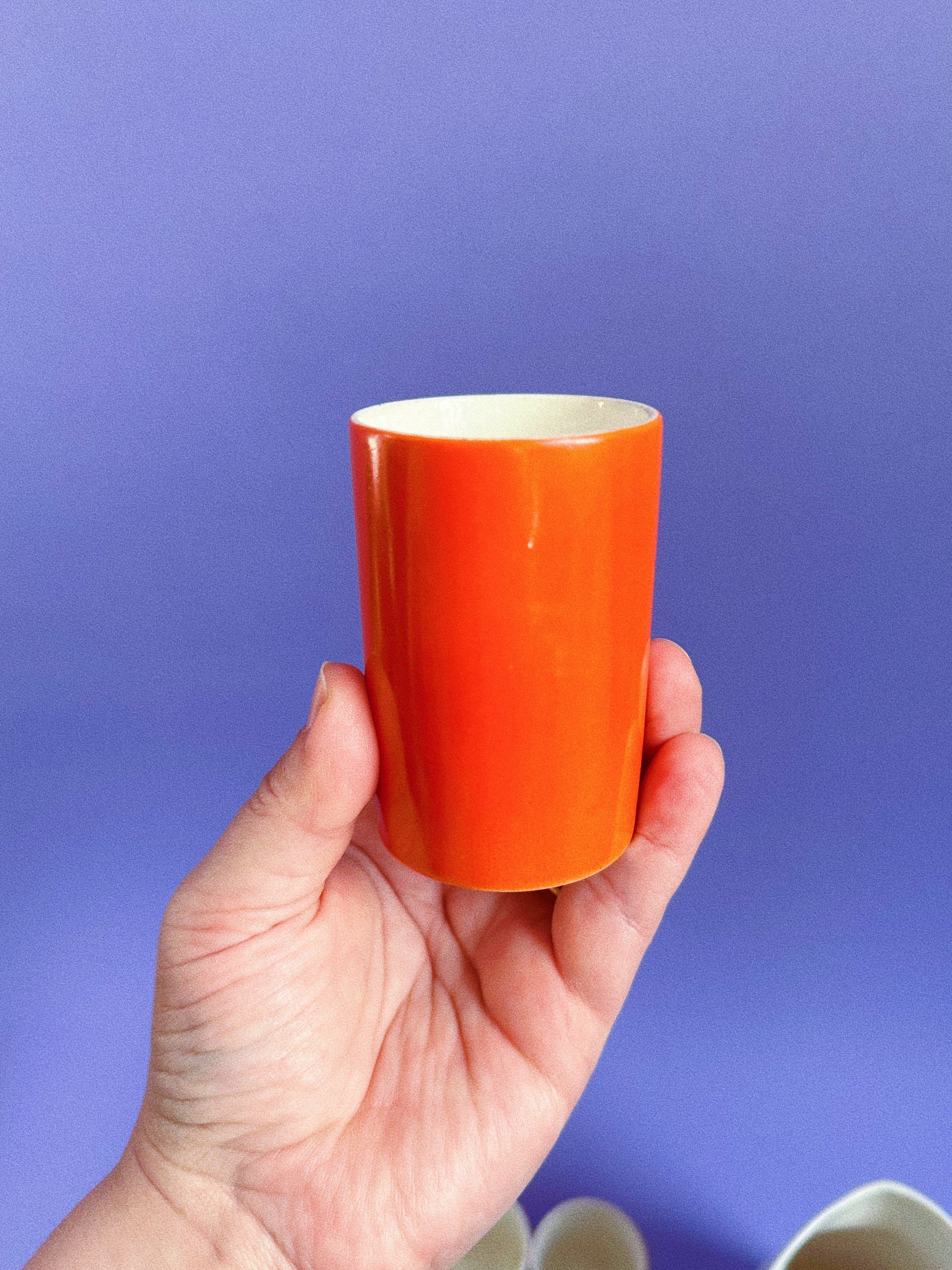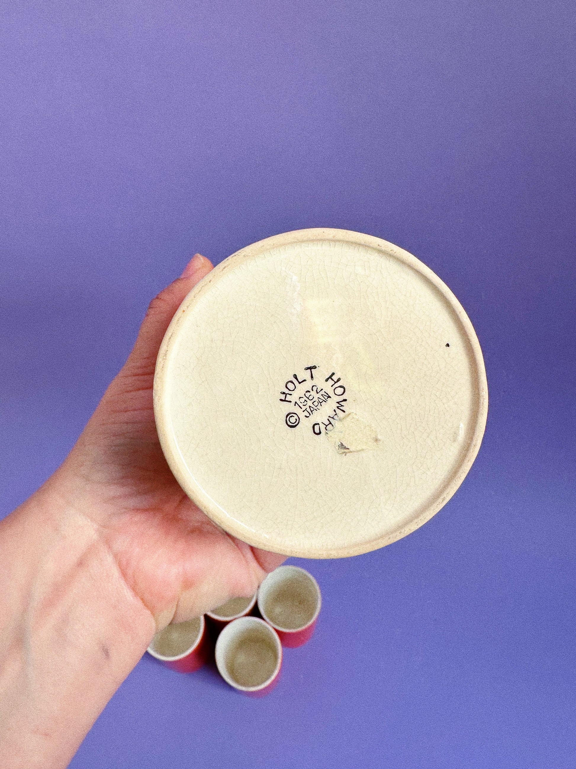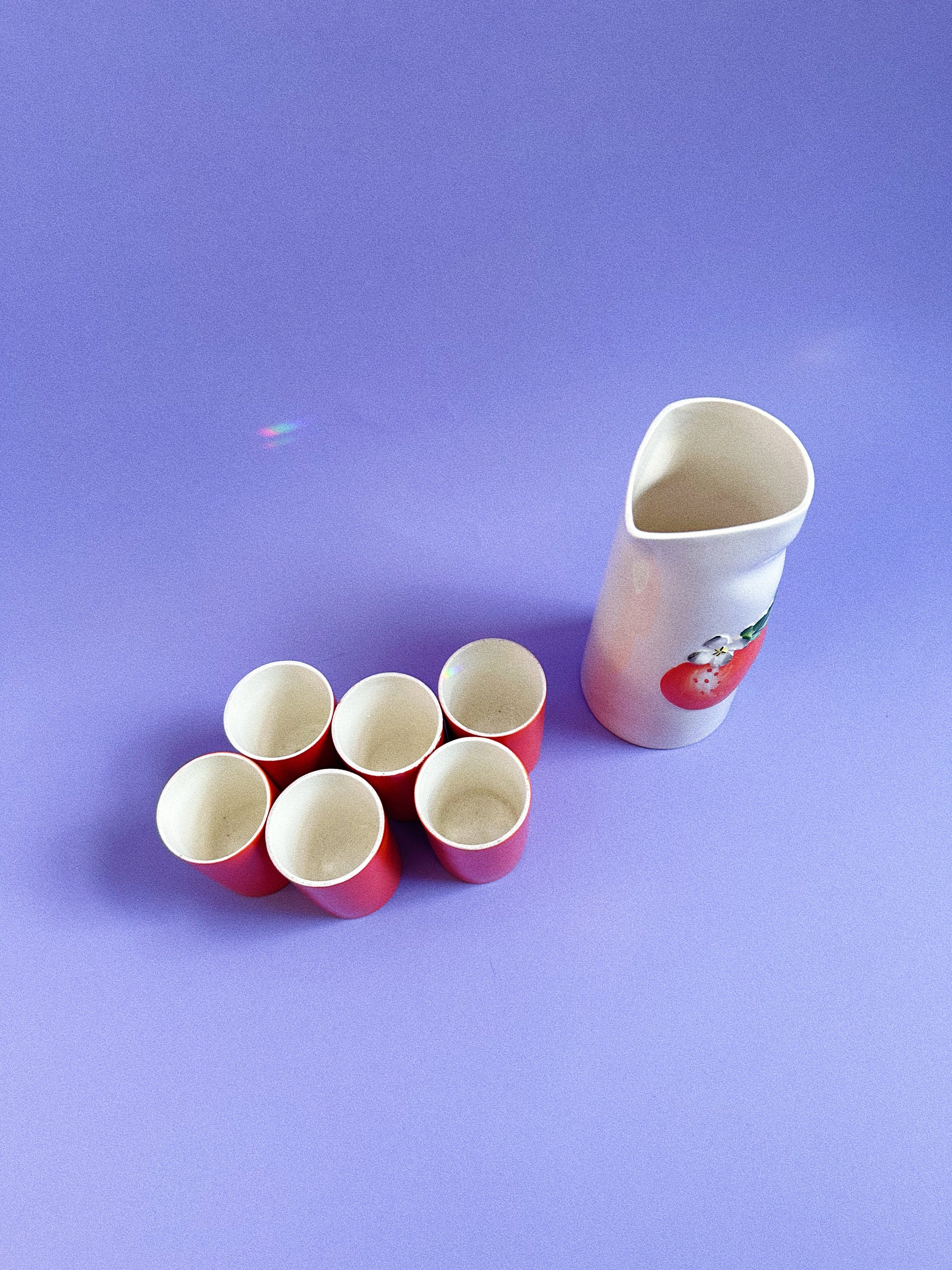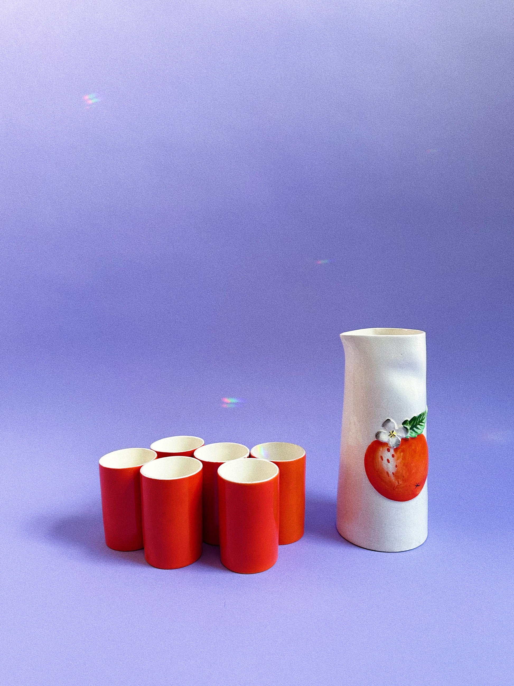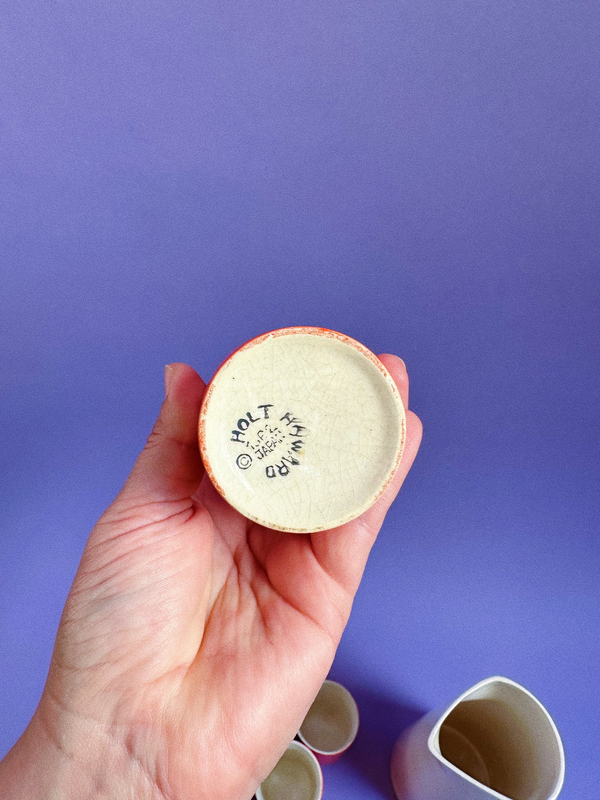 Fun ceramic MCM Holt Howard 1962 orange juice pitcher and 6 juice glasses.