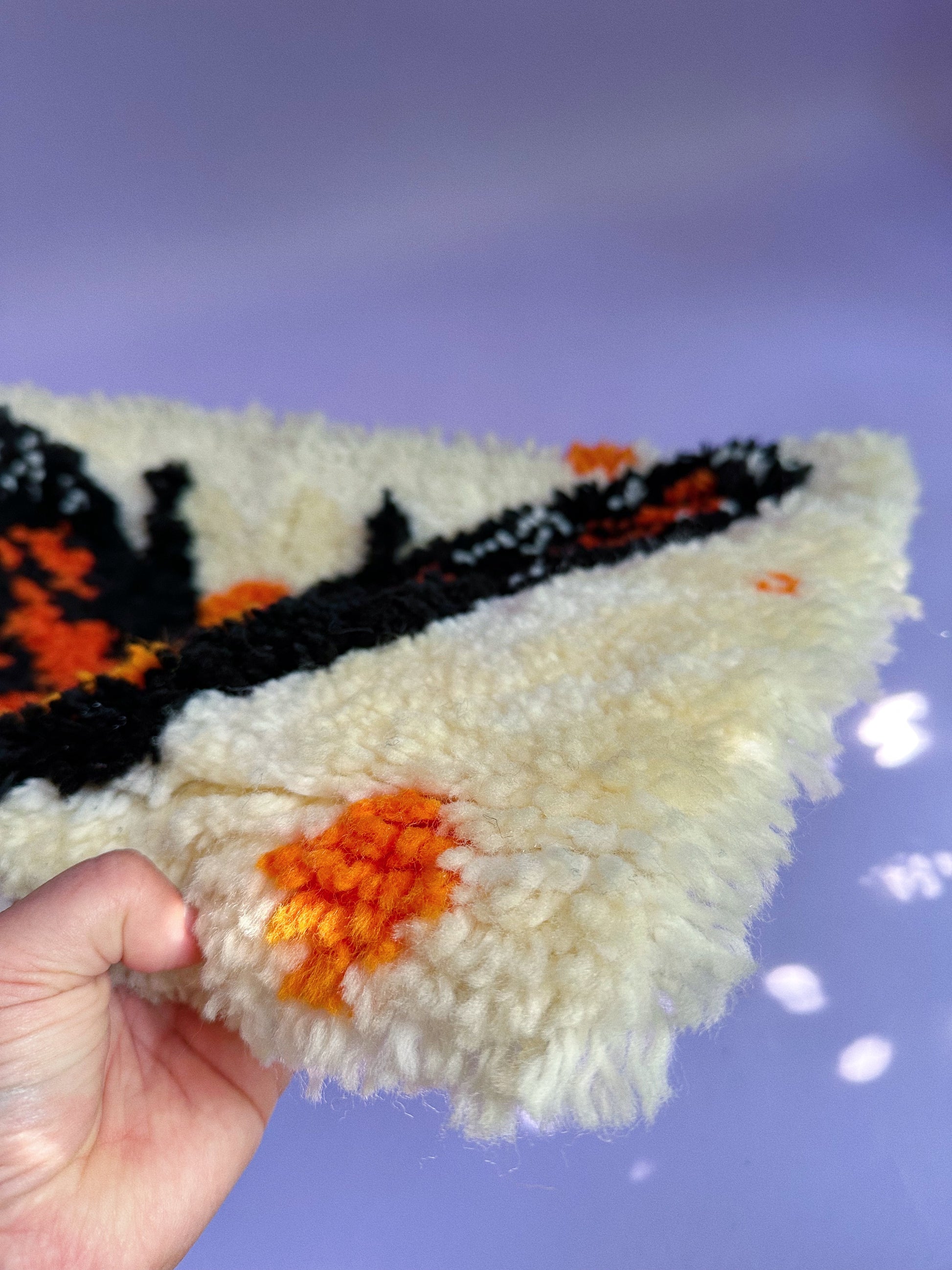Beautiful vintage monarch butterfly latch hook piece. The butterfly part is more raised than the rest for a 3D like effect.