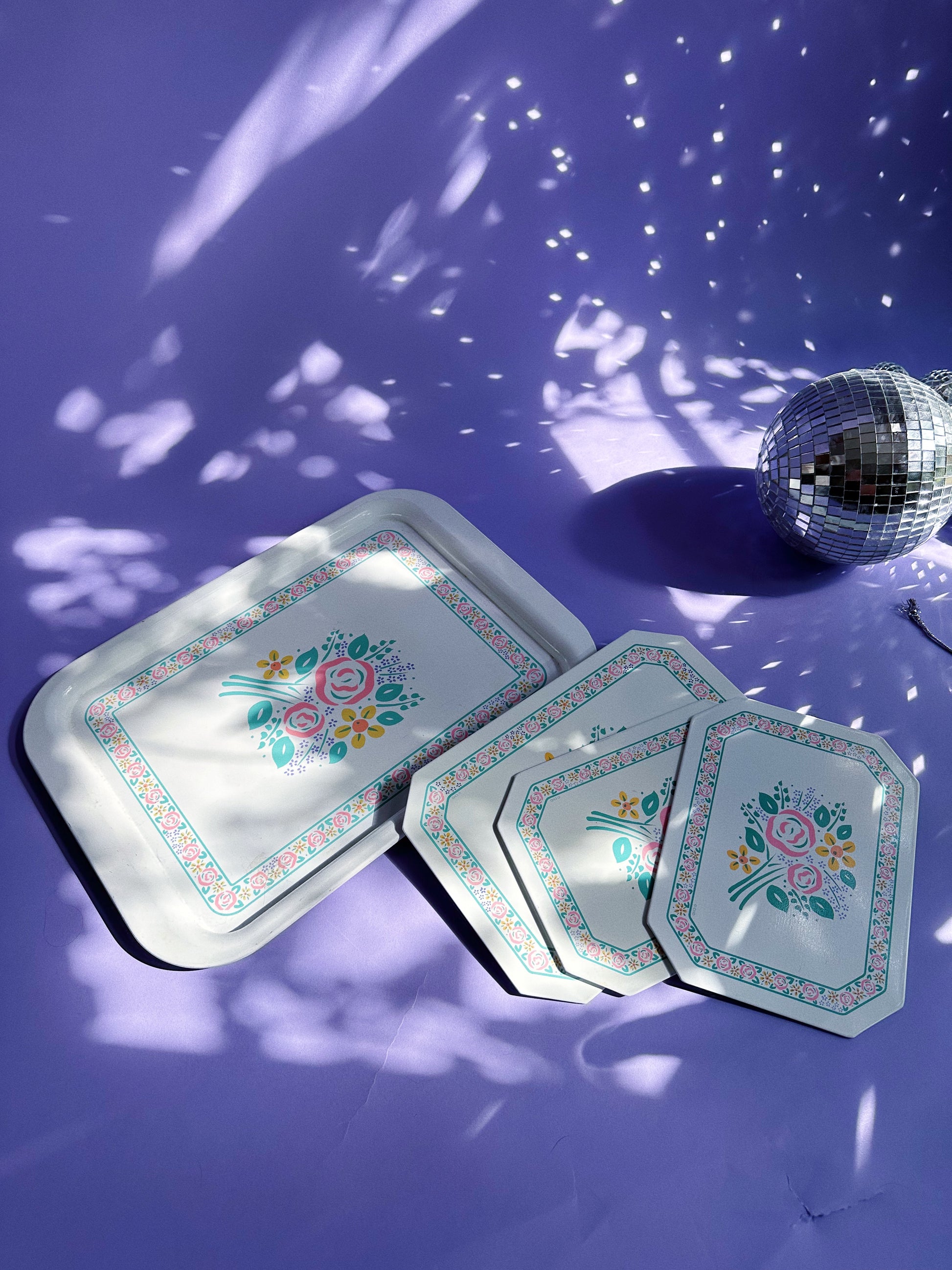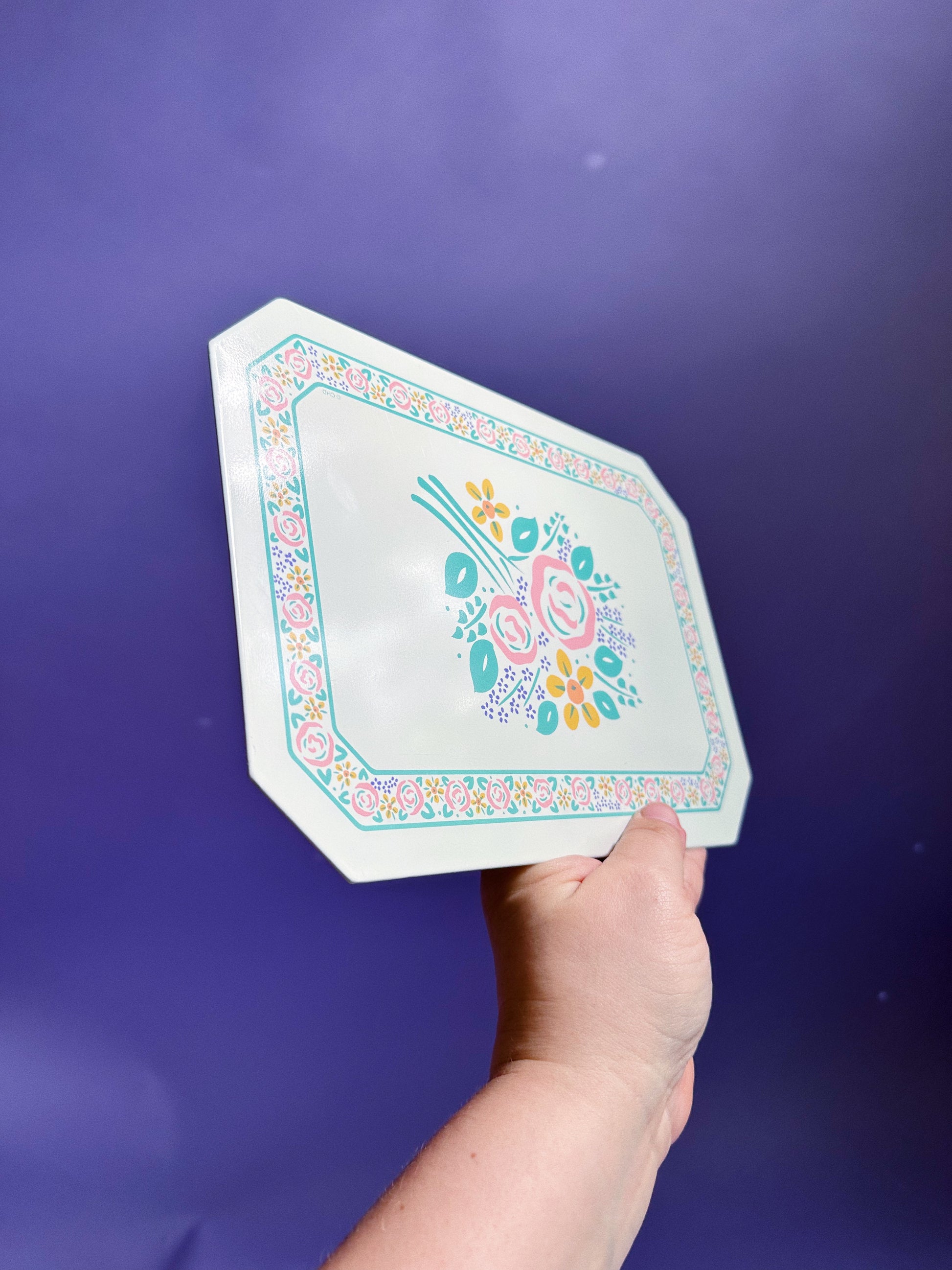 Vintage 80s Floral Metal Tray & Matching Heat Pads / Hot Mats
