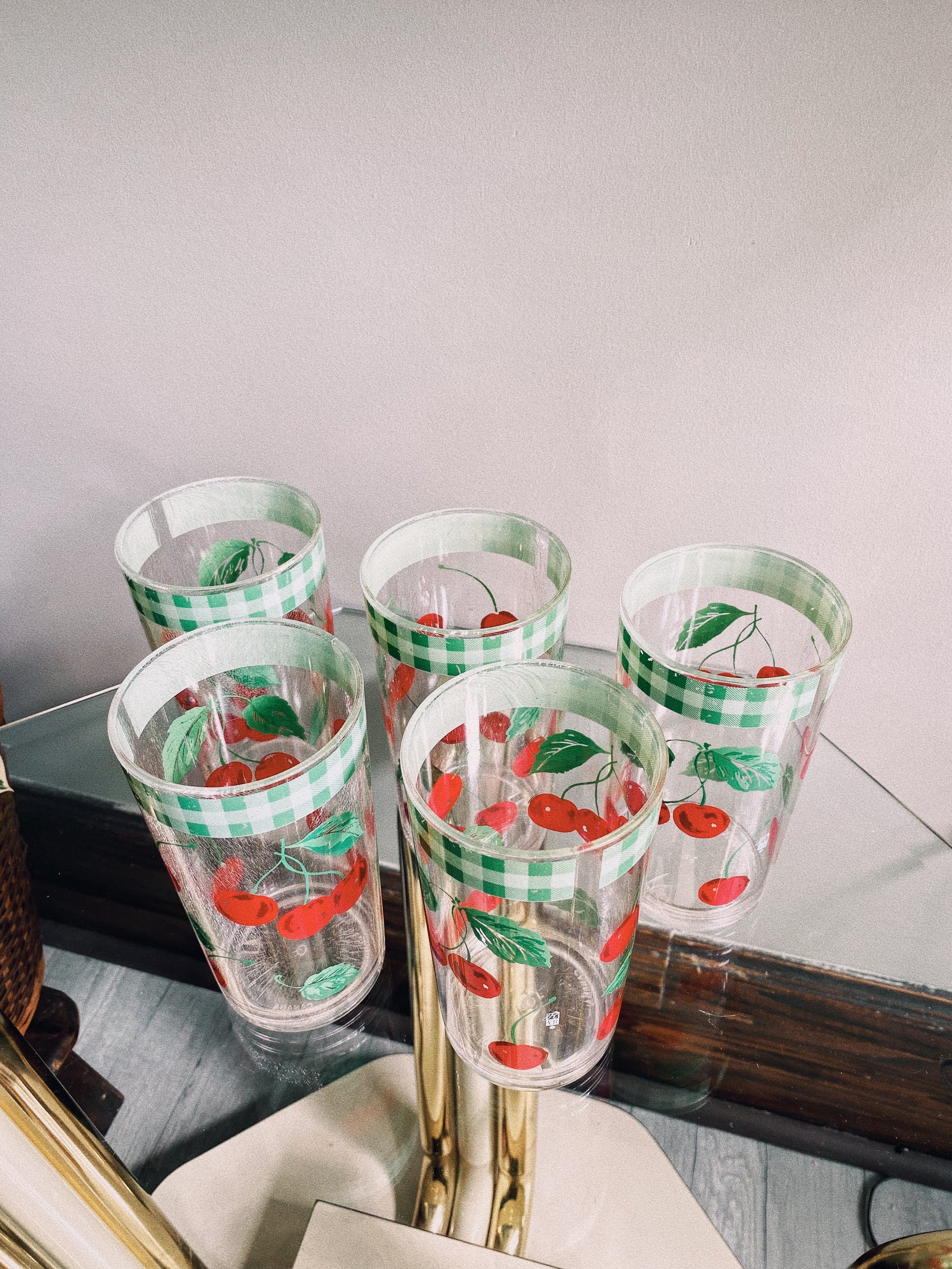 5 x vintage acrylic cherry and green gingham tumblers.