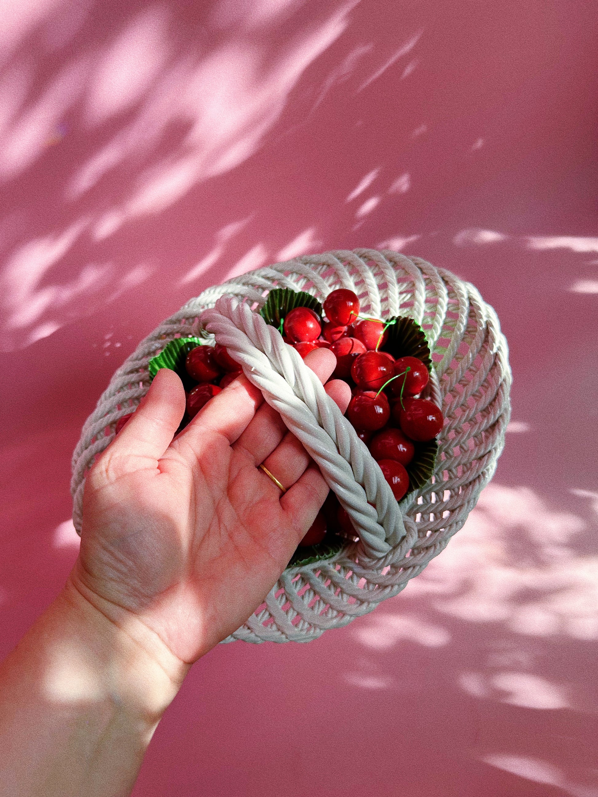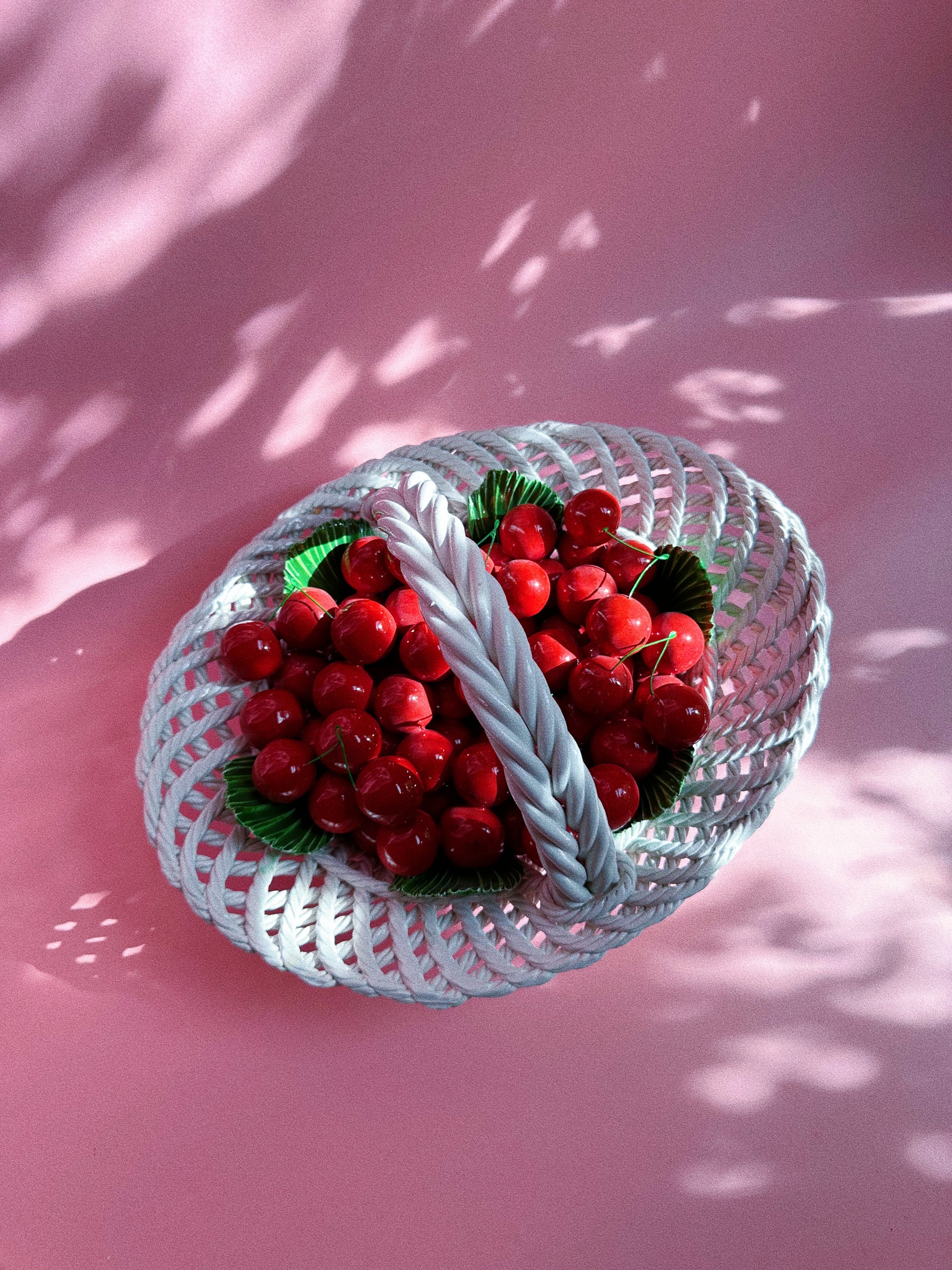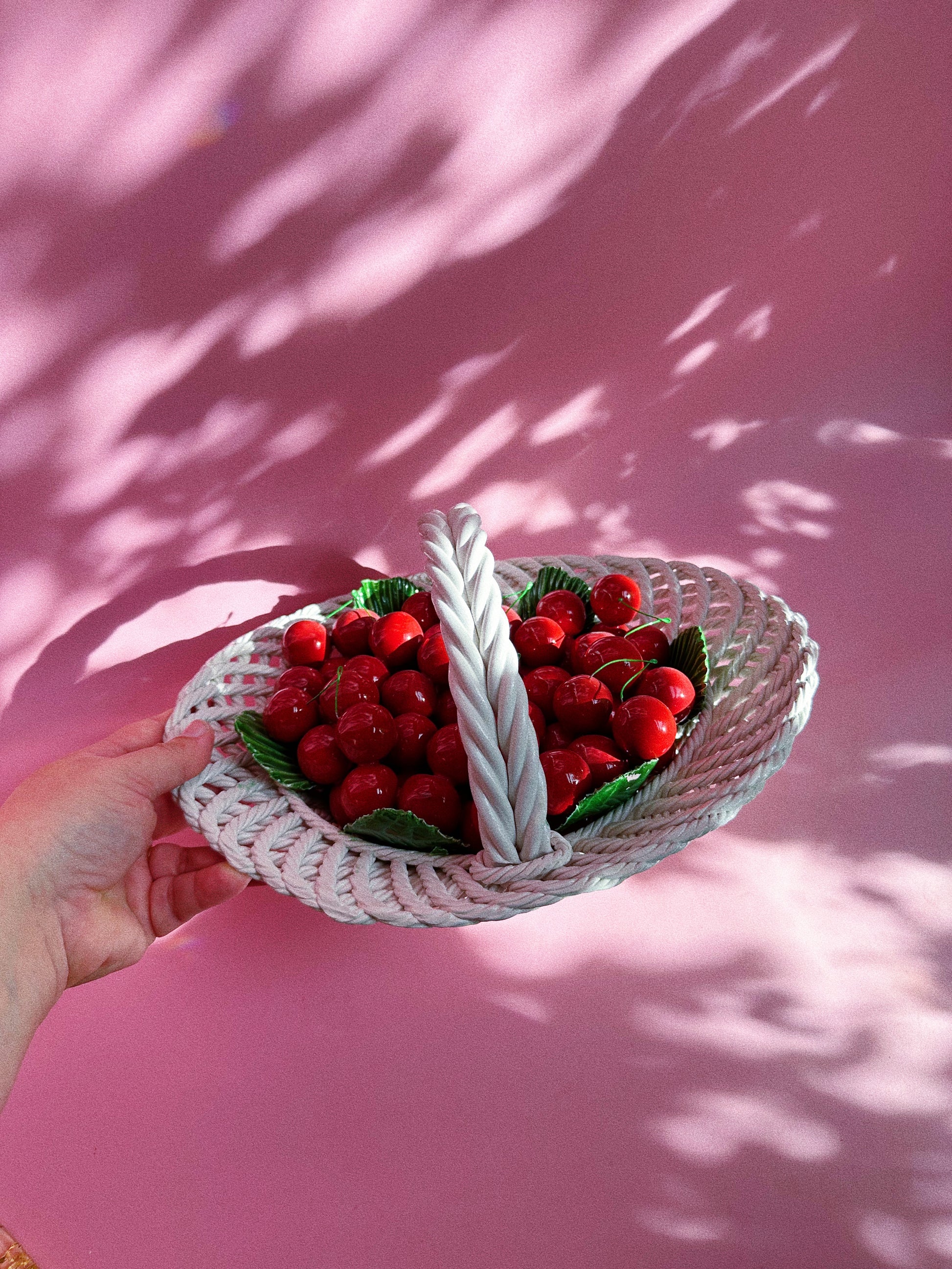 Vintage Capodimonte Large Heavy Weaved Cherry Basket Green Leaves Made In Italy