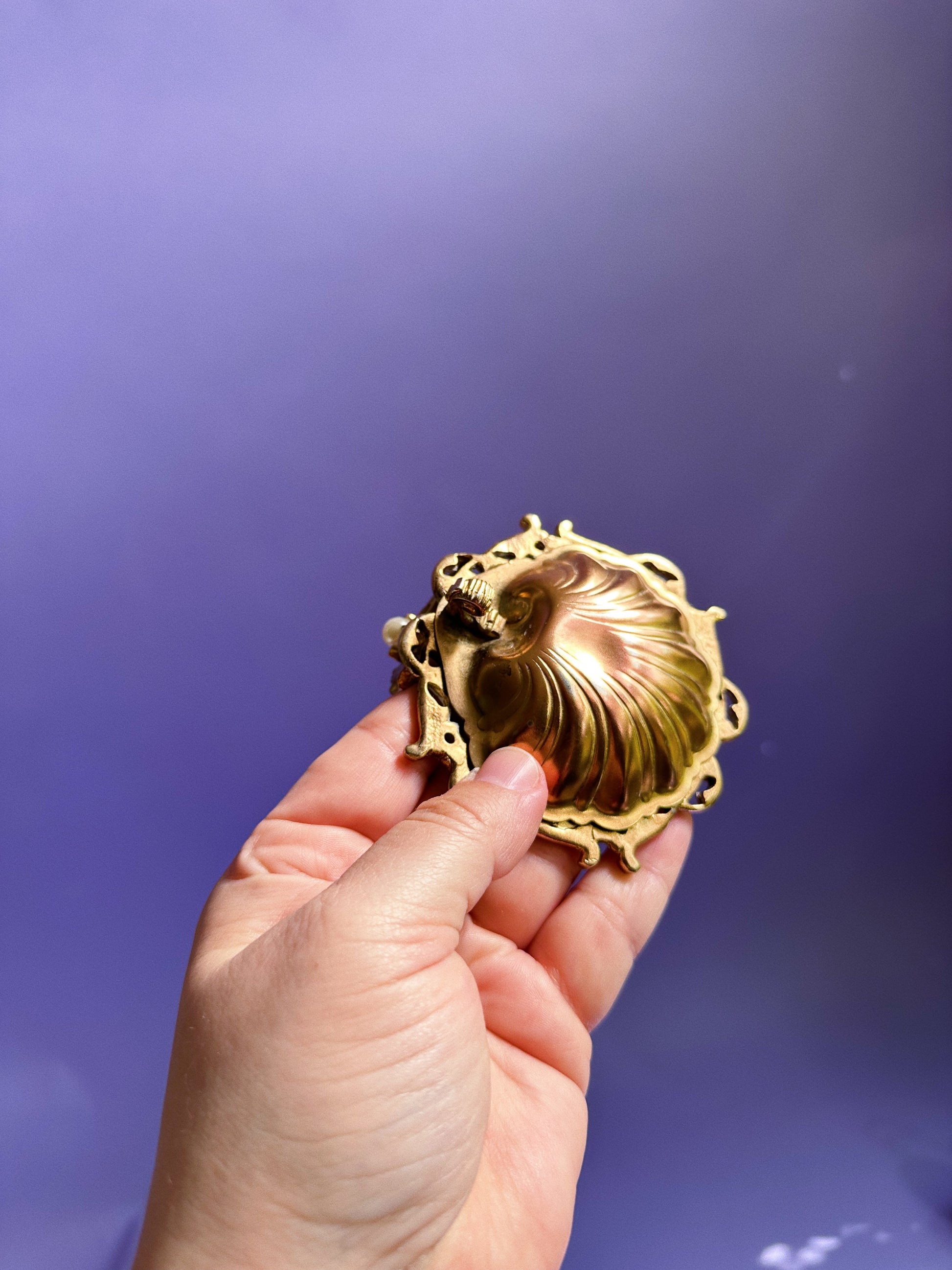 Vintage Gilt Bronze Metal Clam Shaped Dish W Hands and Pearl