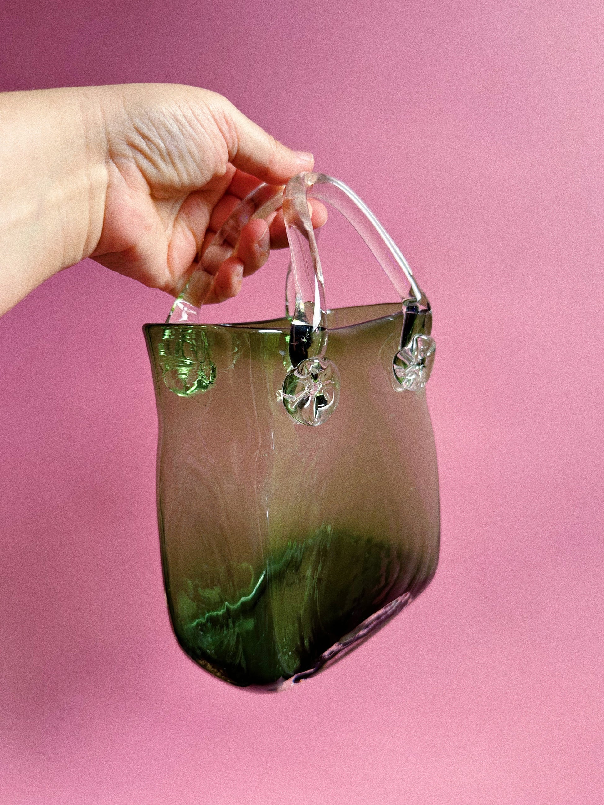 Walk in purse first. Vintage green art glass purse vase.