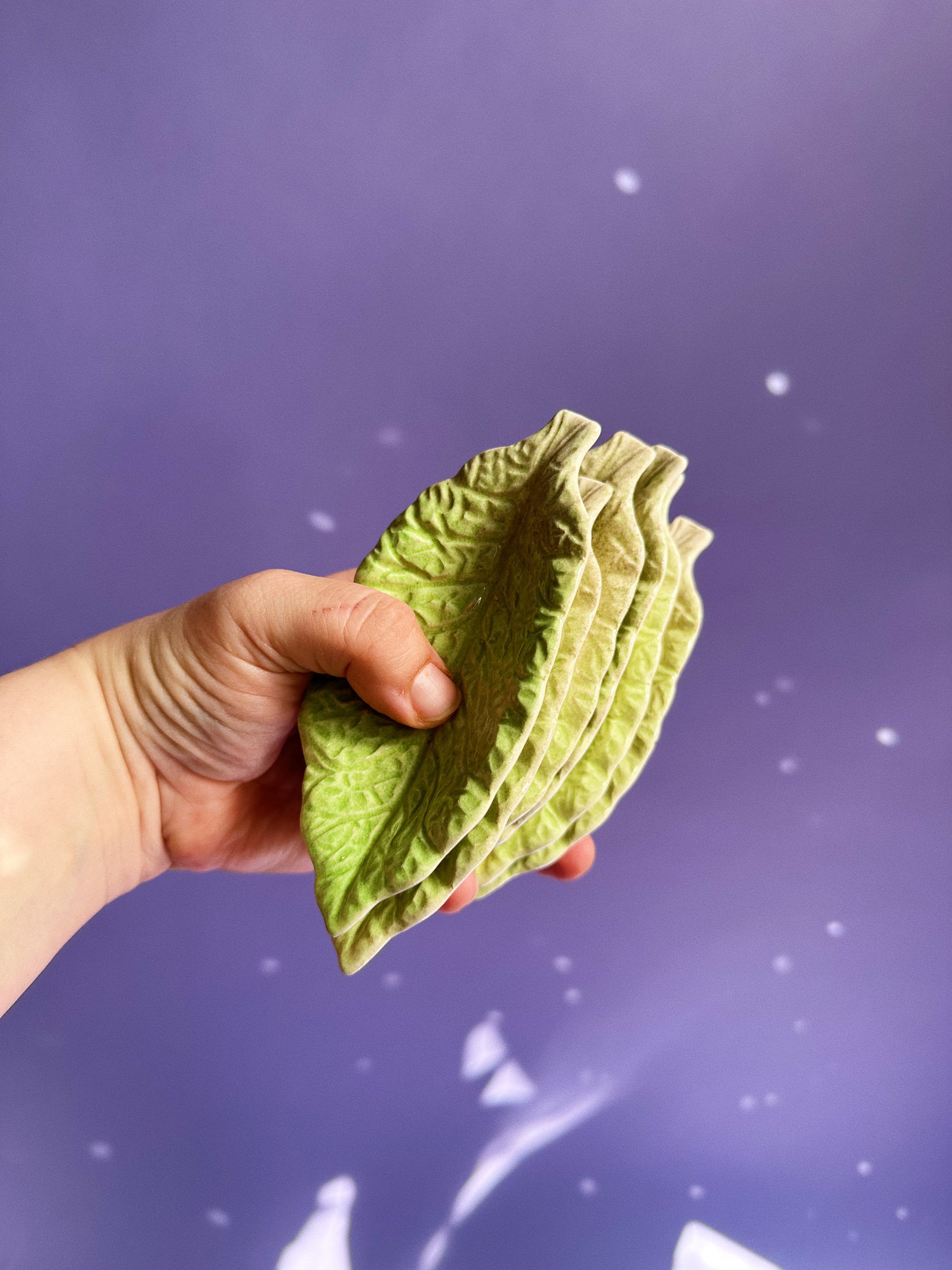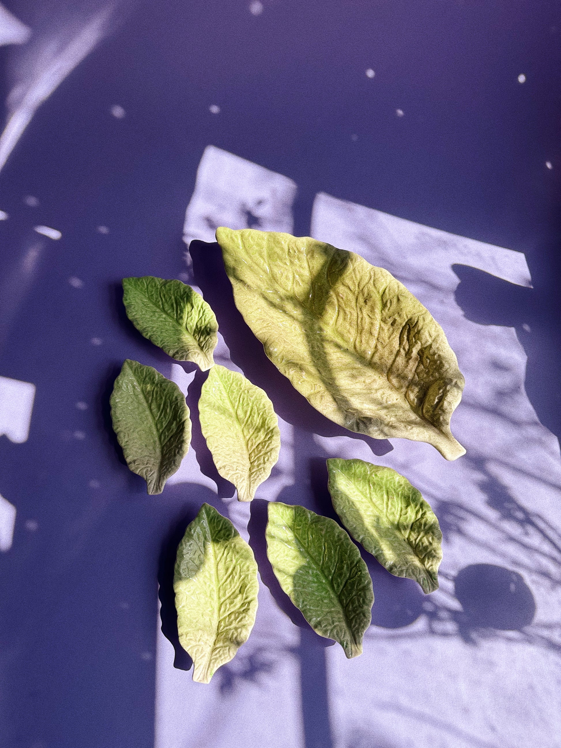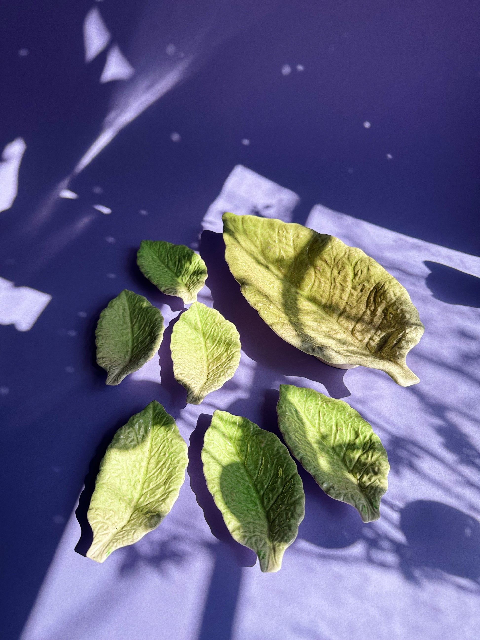 Really cool leaf trays. One larger platter and 6 small dishes.