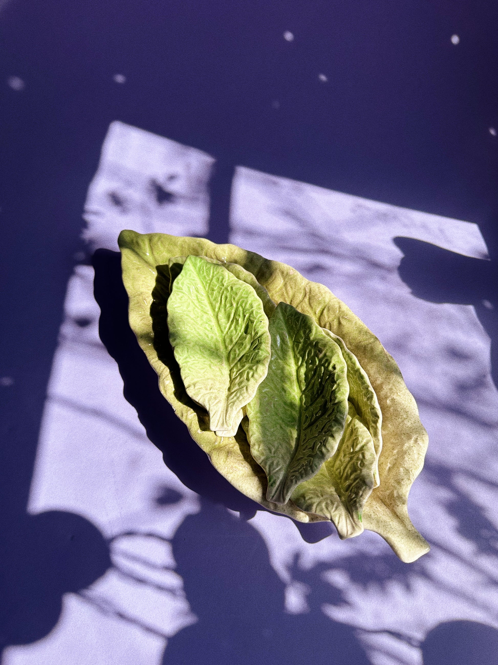 Vintage Majolica Green Leaf Lettuce Cabbage Snack Tray + 6 Leaf Dishes Japan