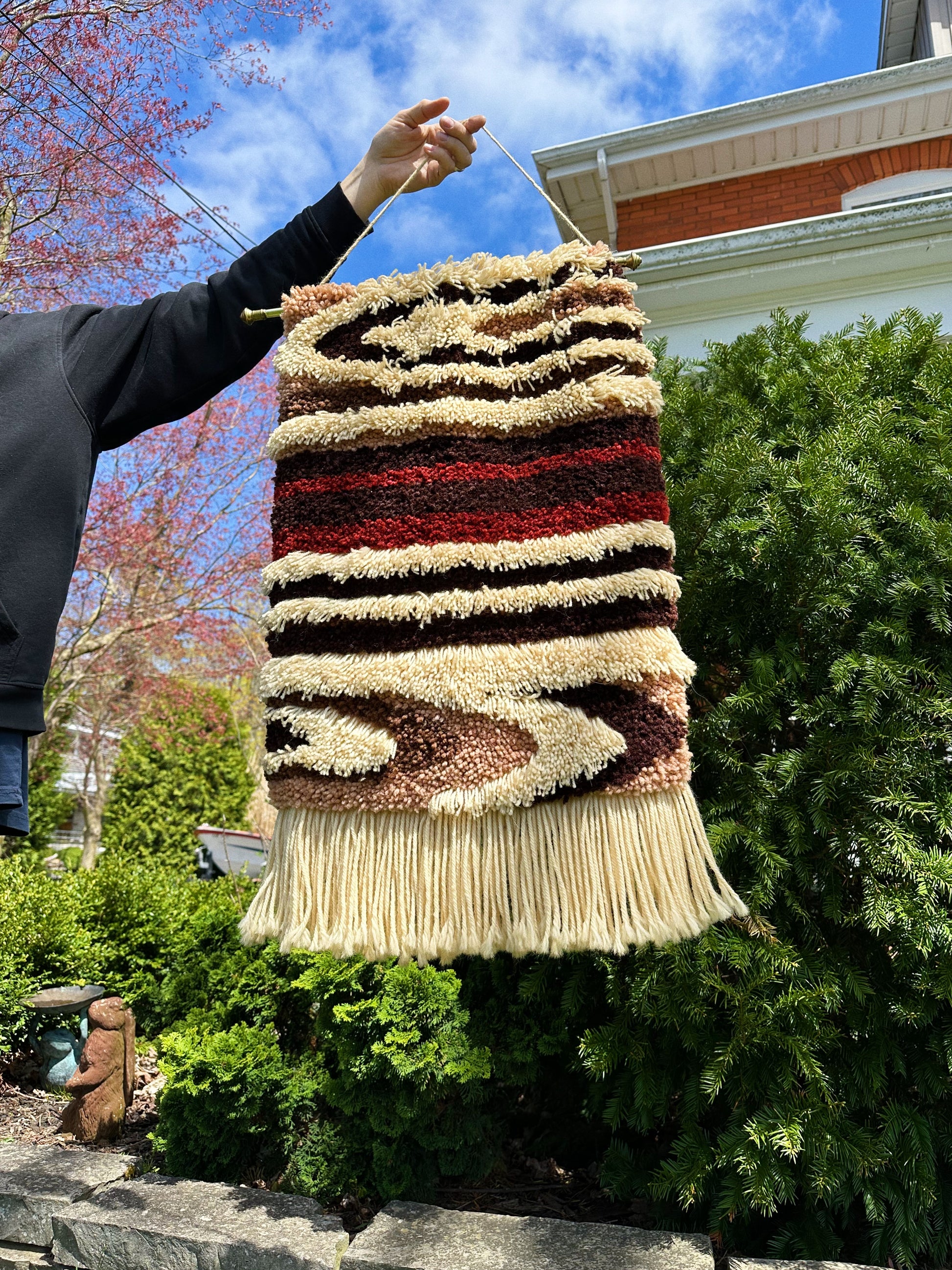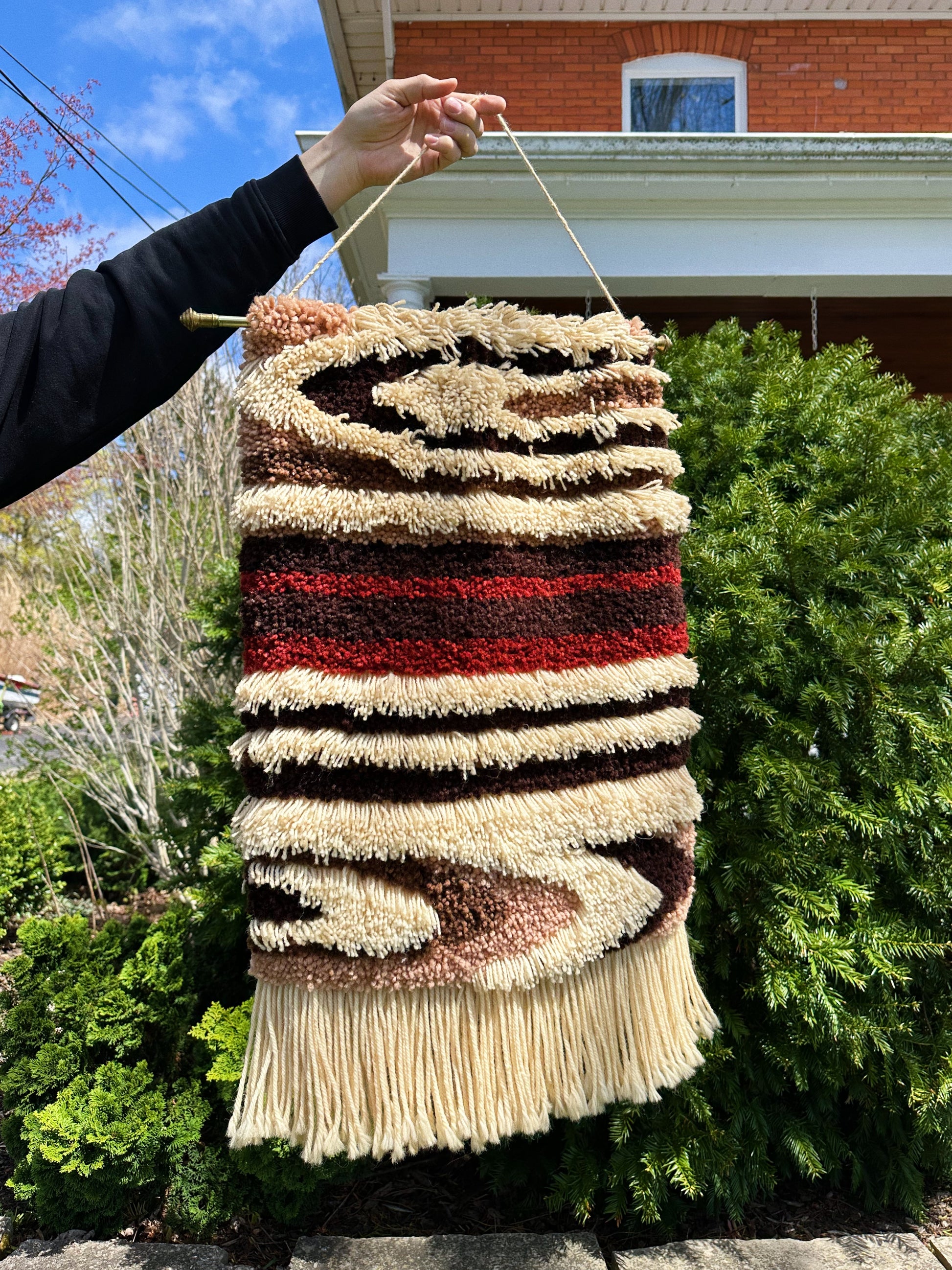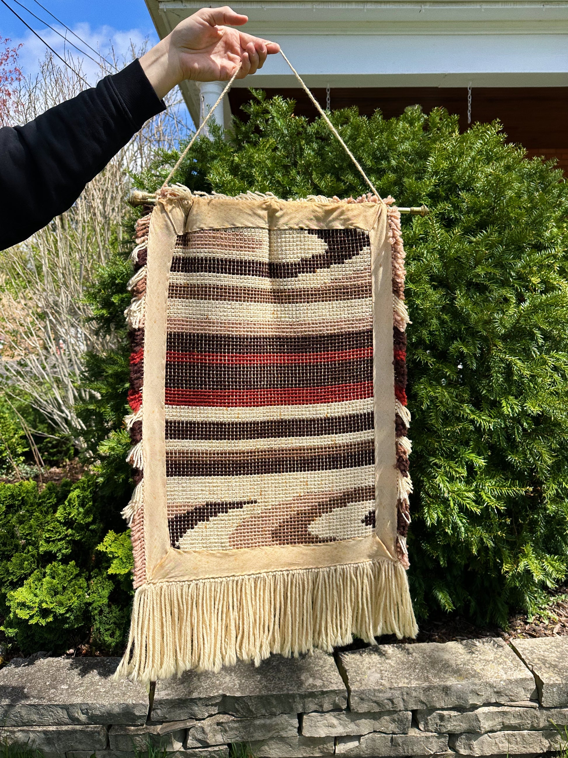 Vintage MCM Latch Hook Wall Art Brass Rod Hanging