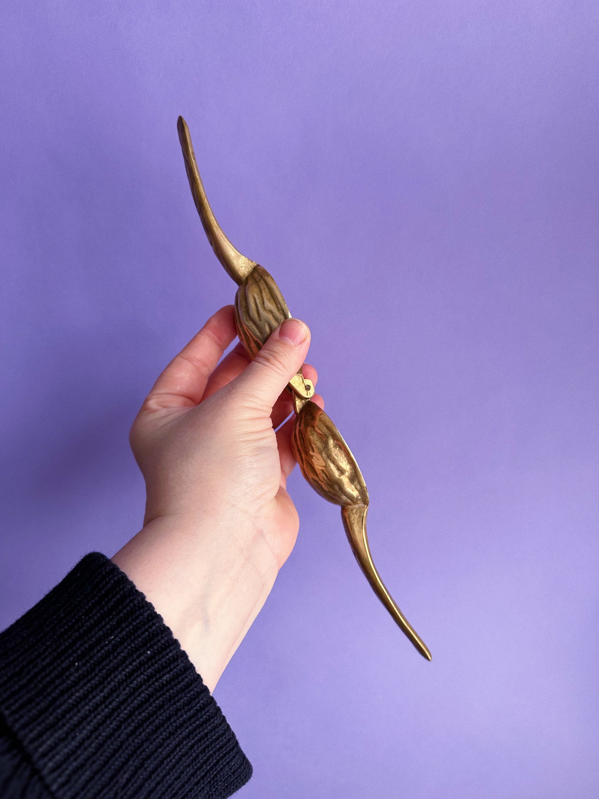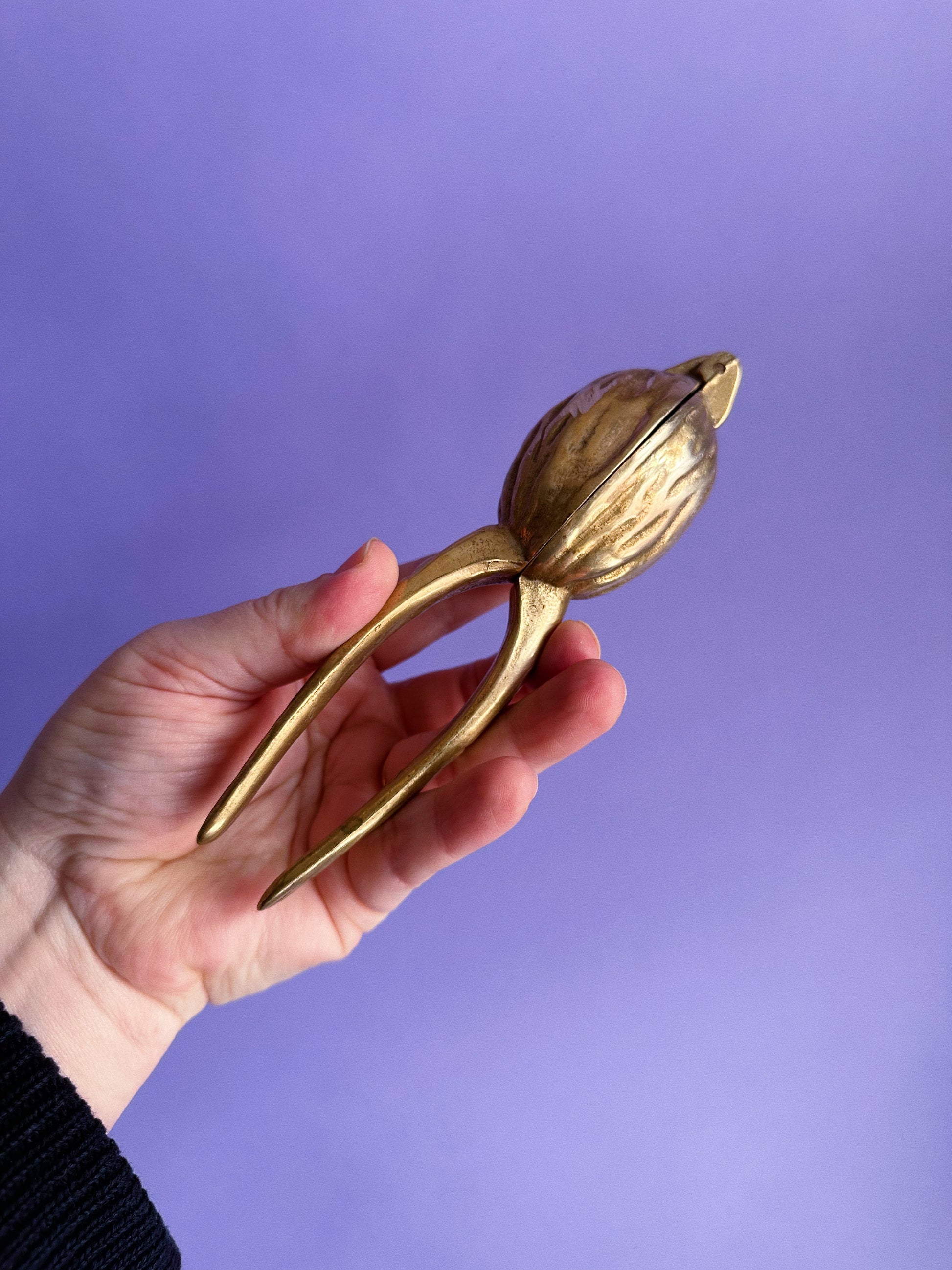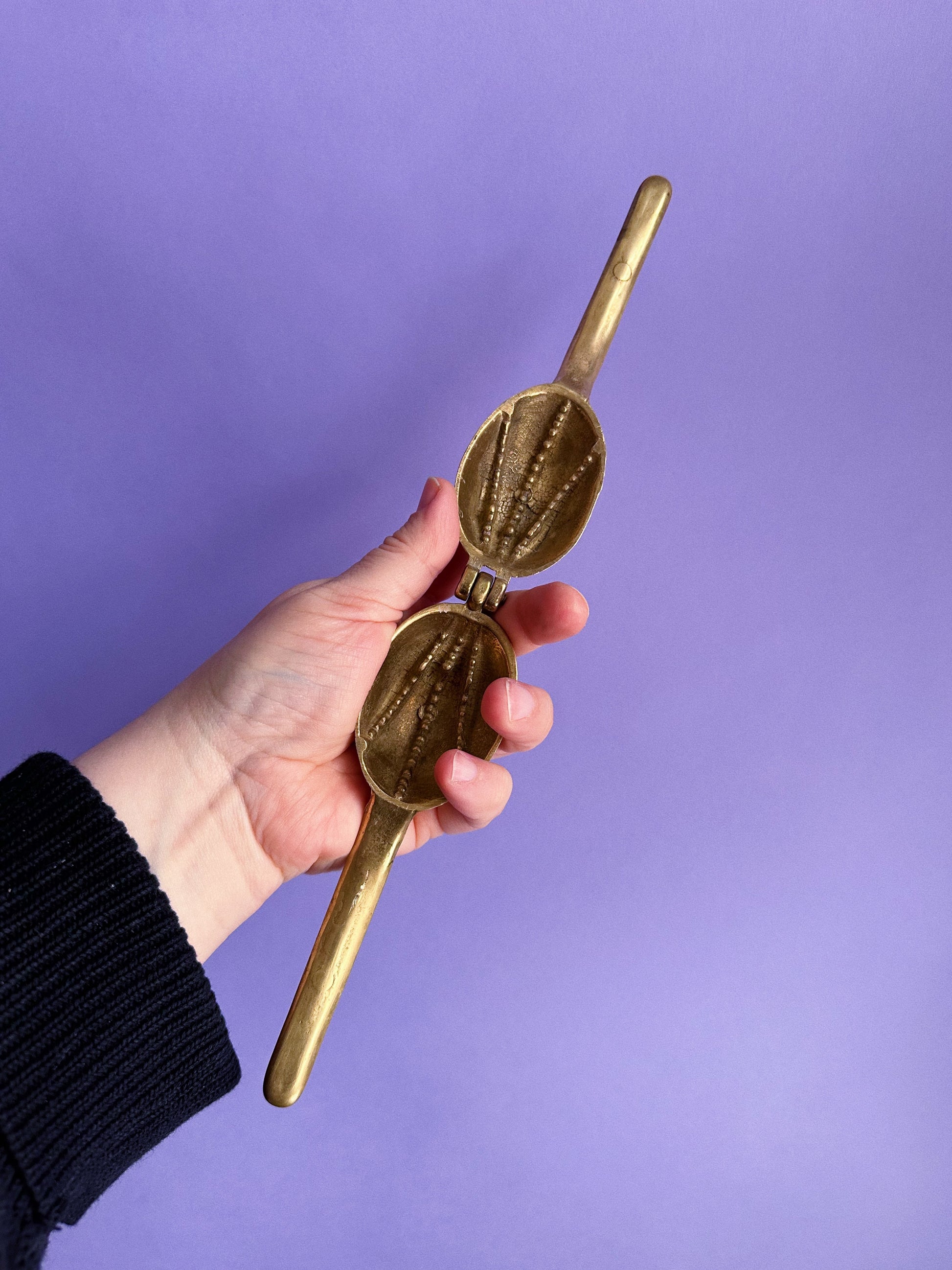 Vintage Old Handcrafted Brass Line Engraved Walnut Cracker Kitchen Tool