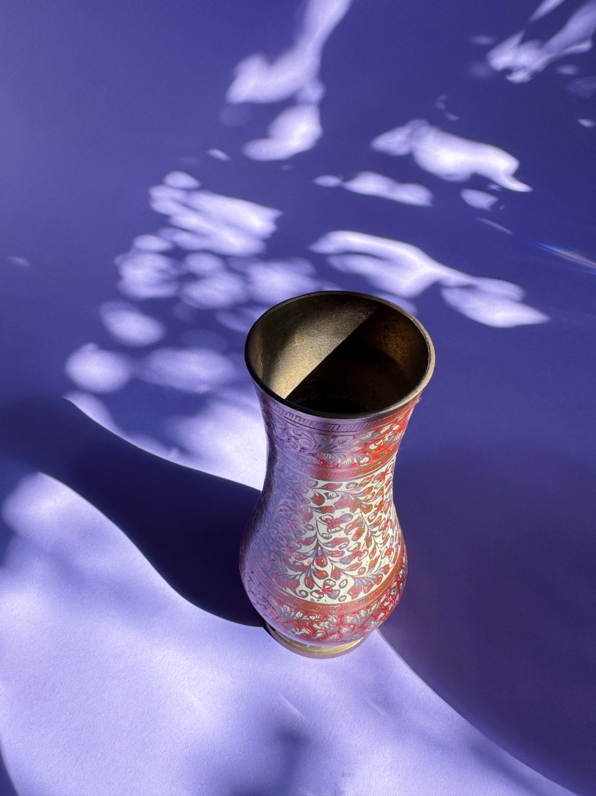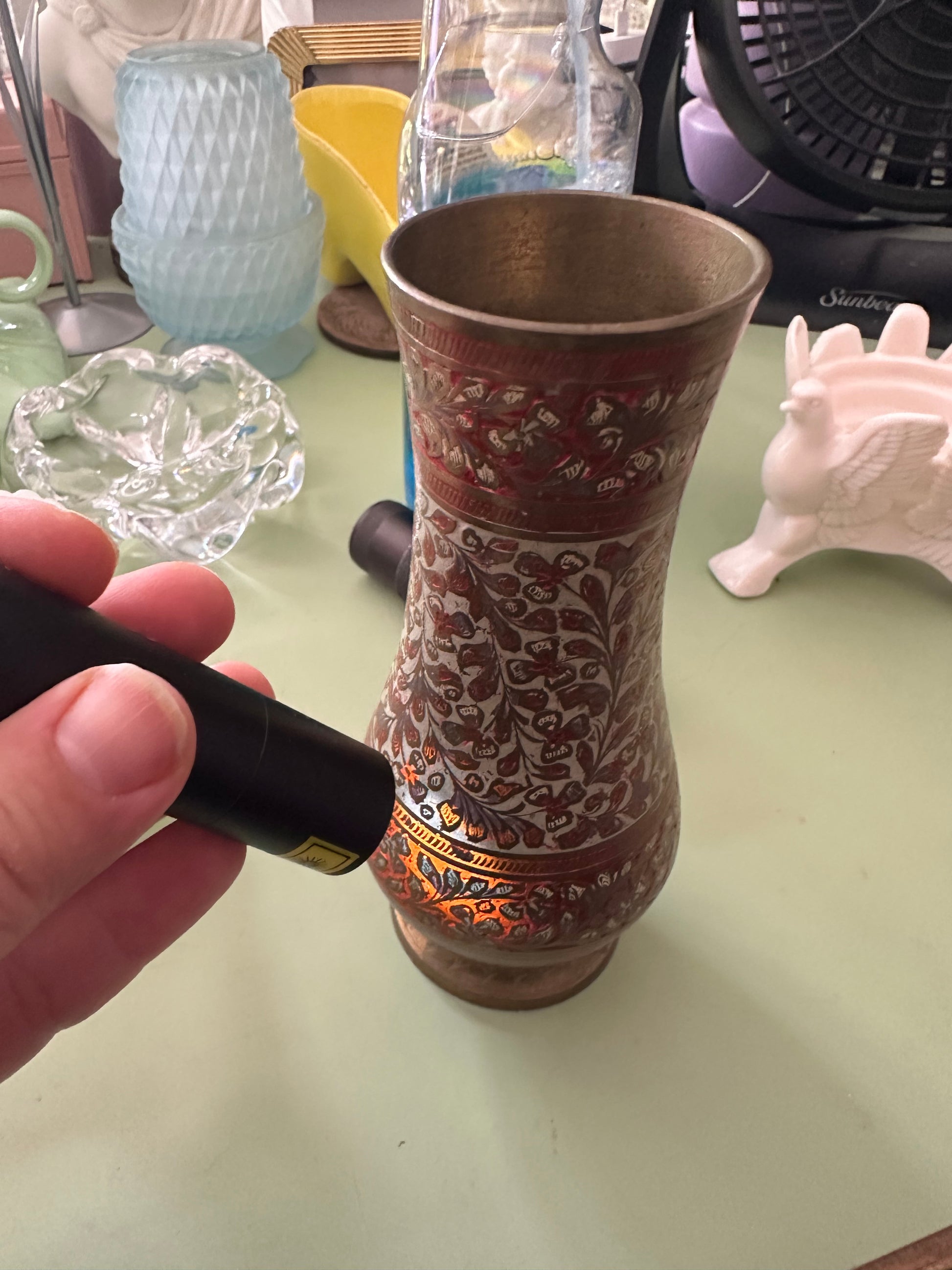Vintage Orange Glowing Brass Vase W Enamel Detail