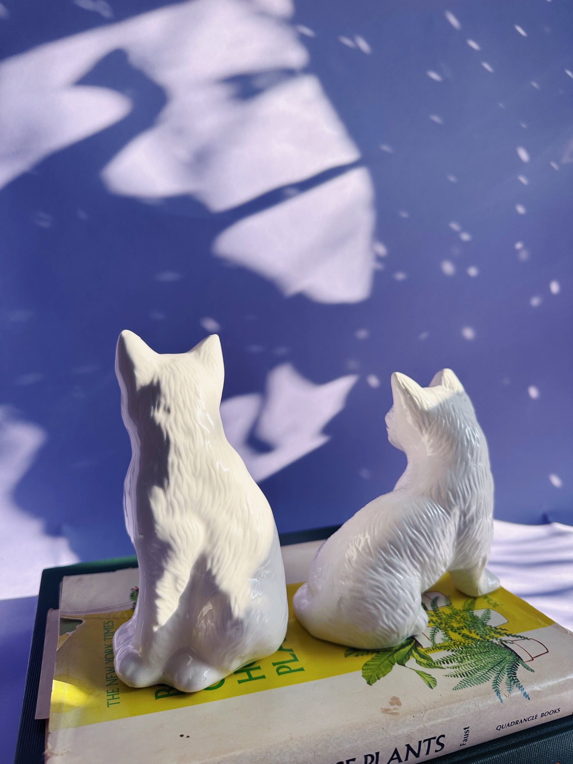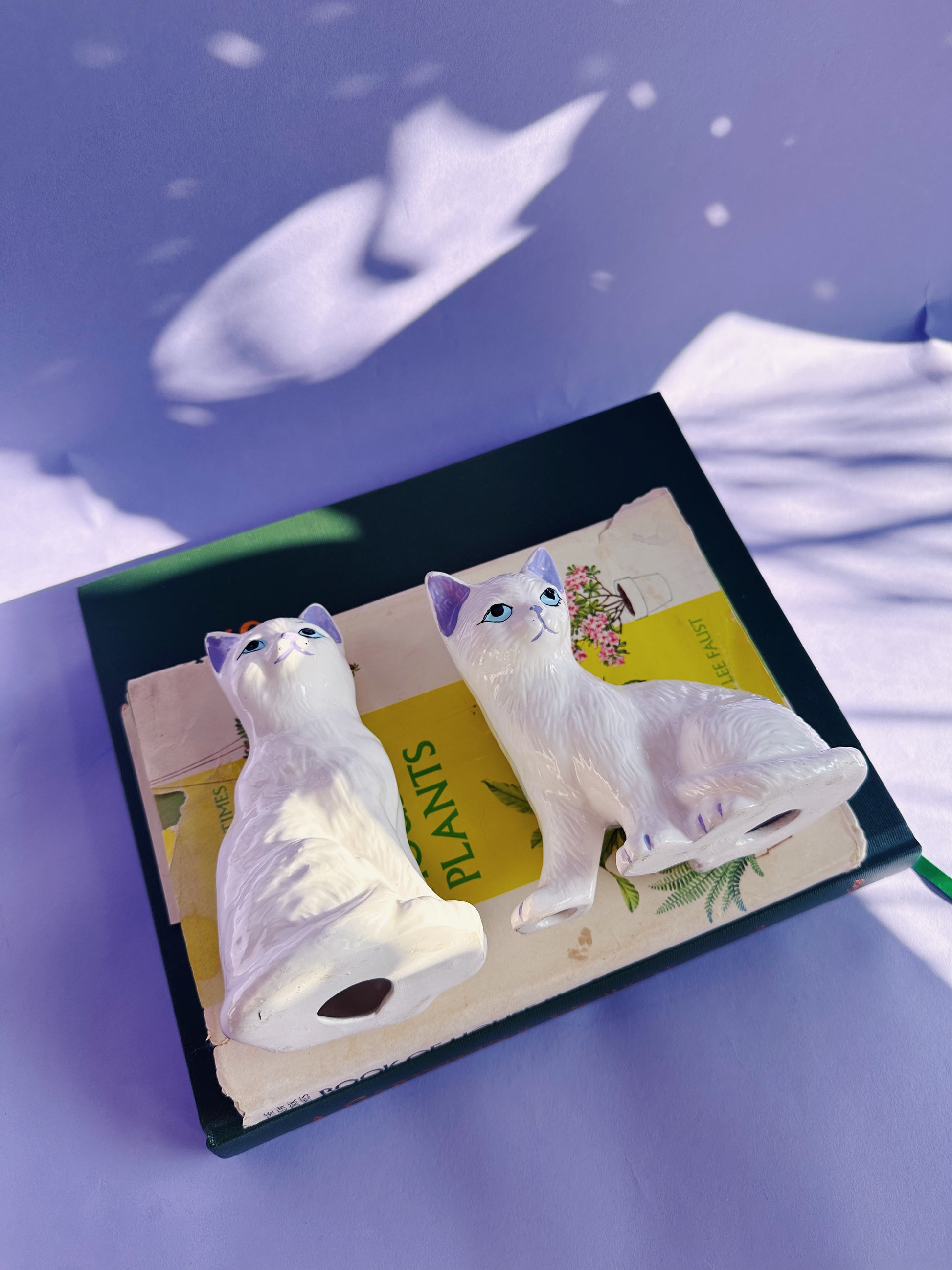 Vintage Pair of Ceramic White Cat Sculptures w Purple Details