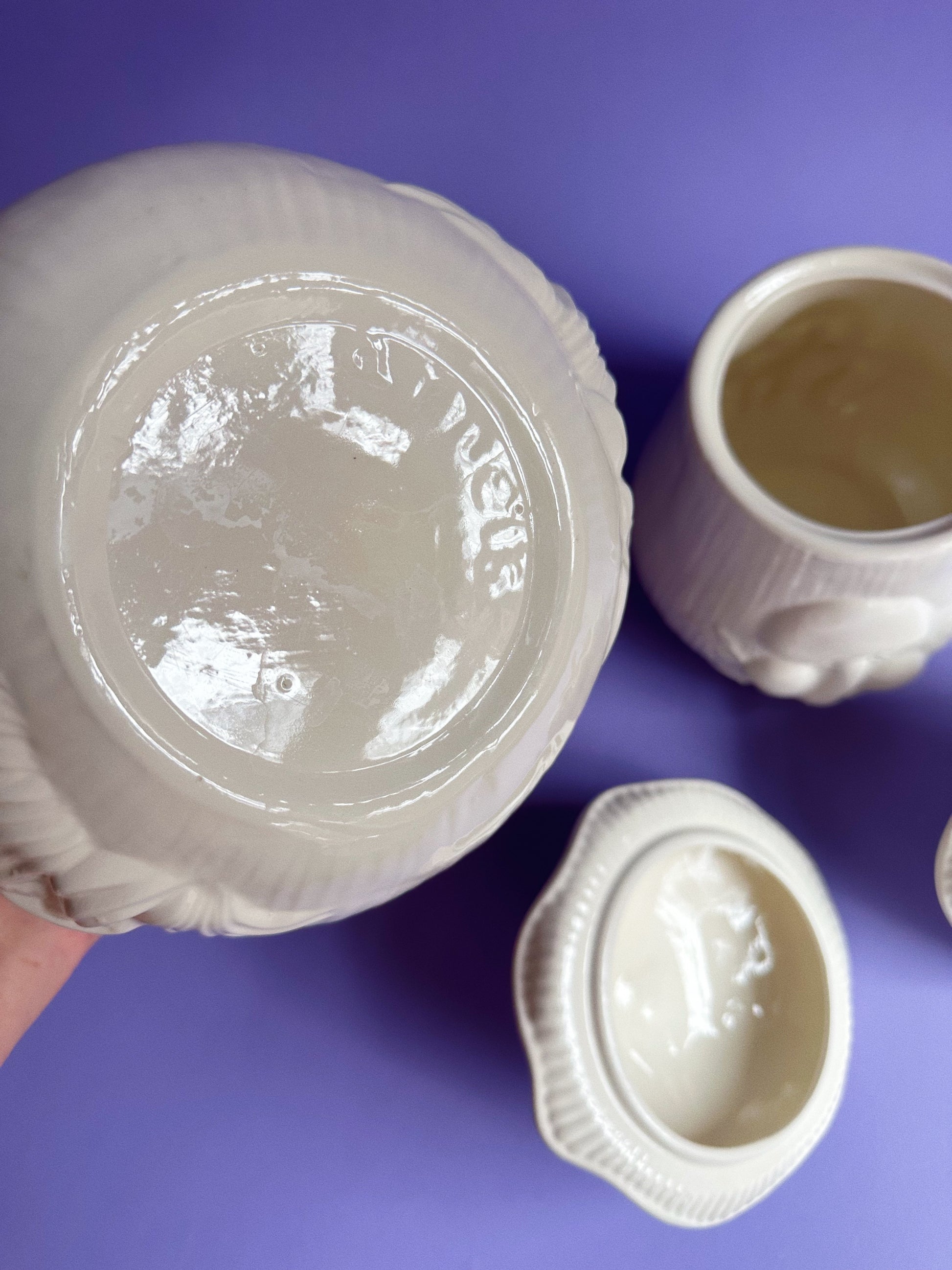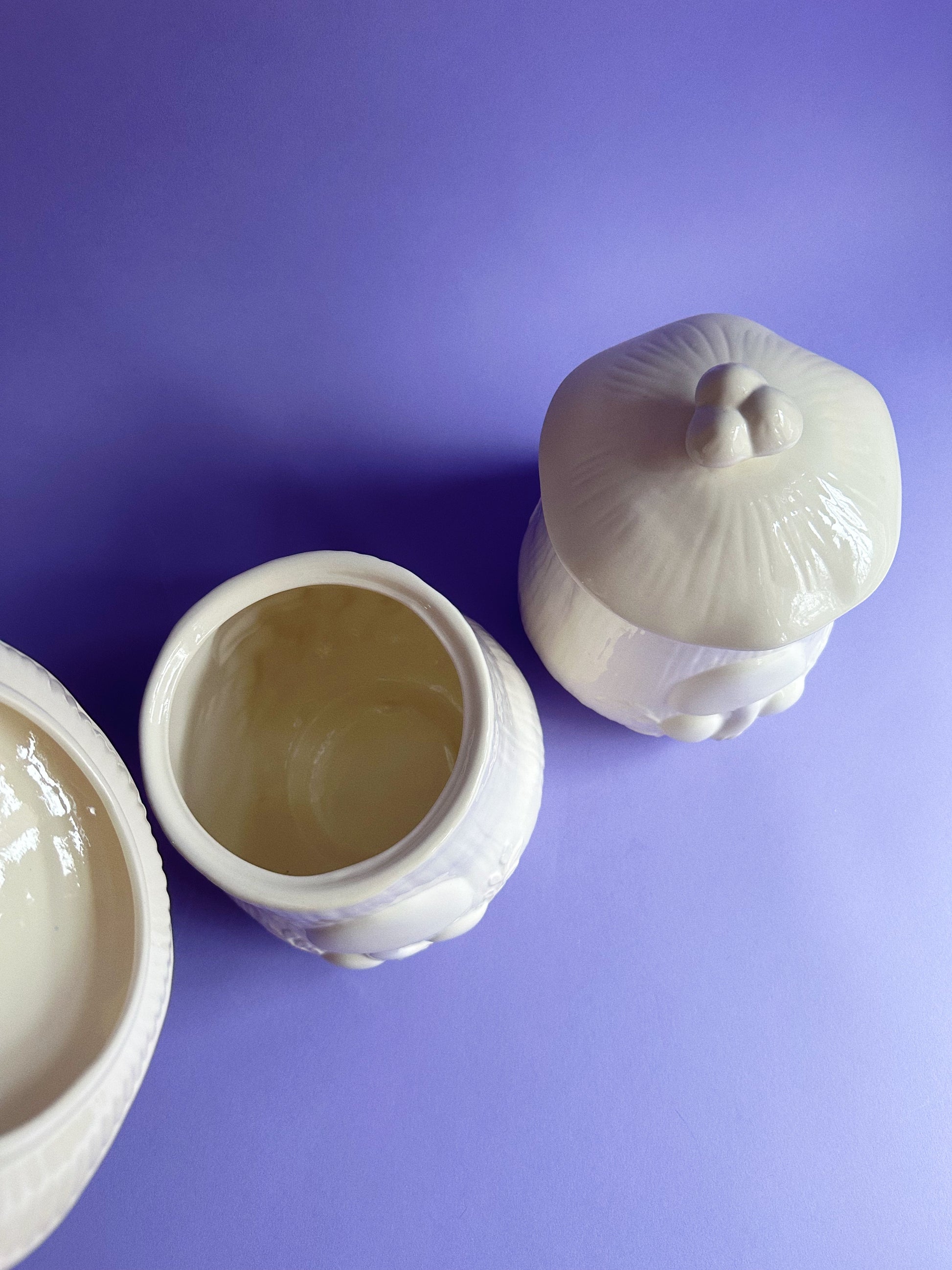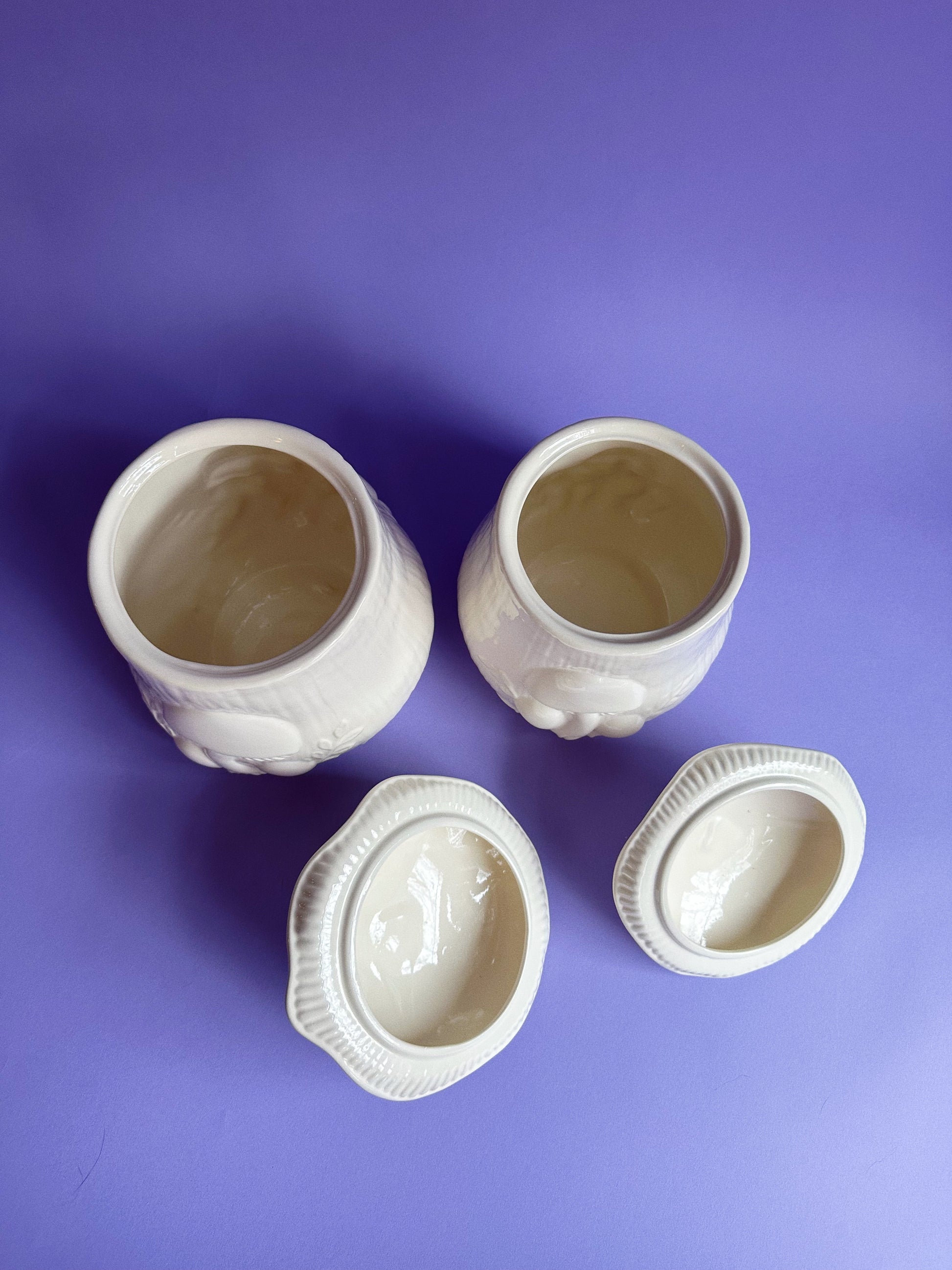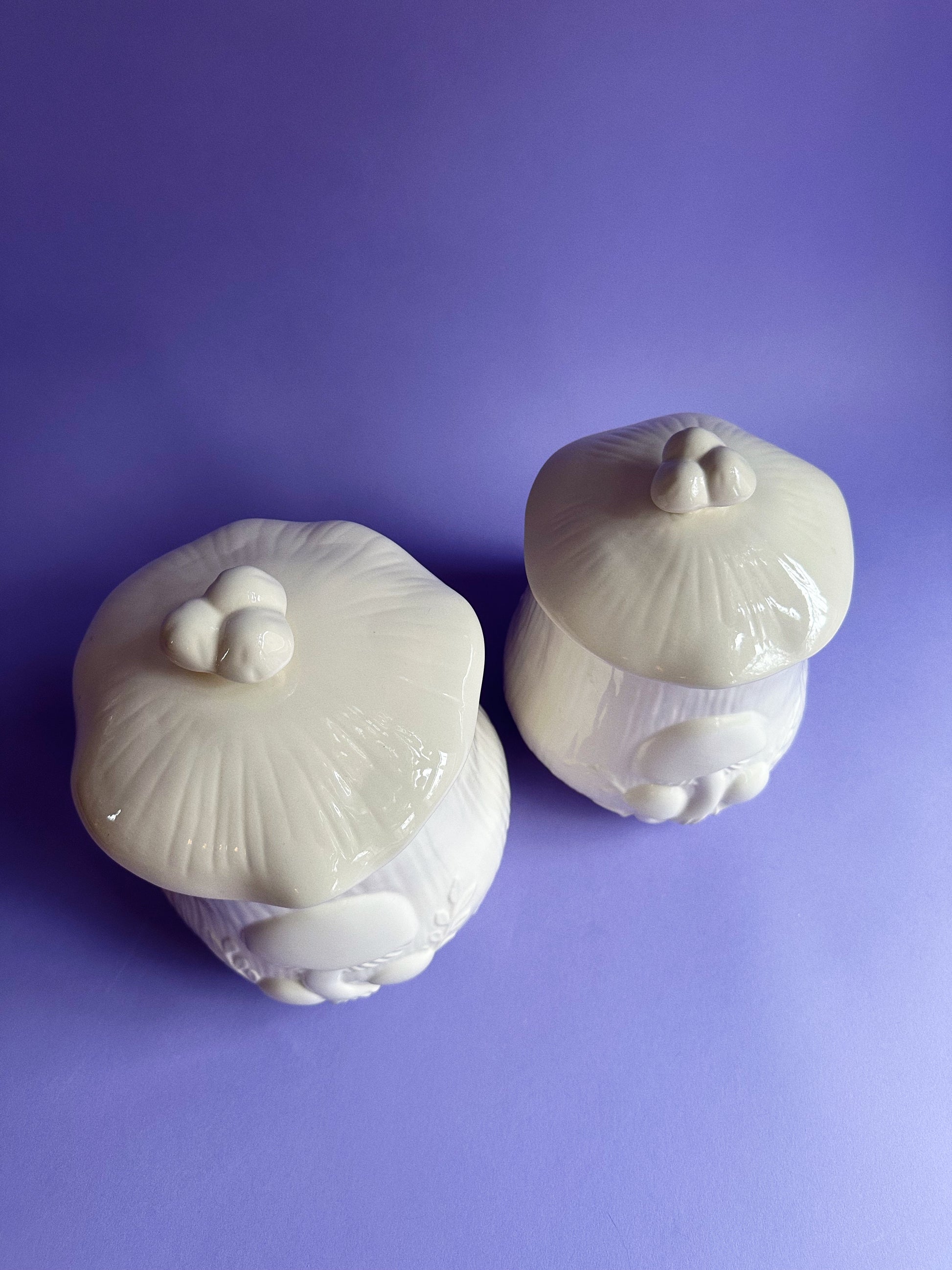 glossy glazed pair of white Arnels mushroom canisters.