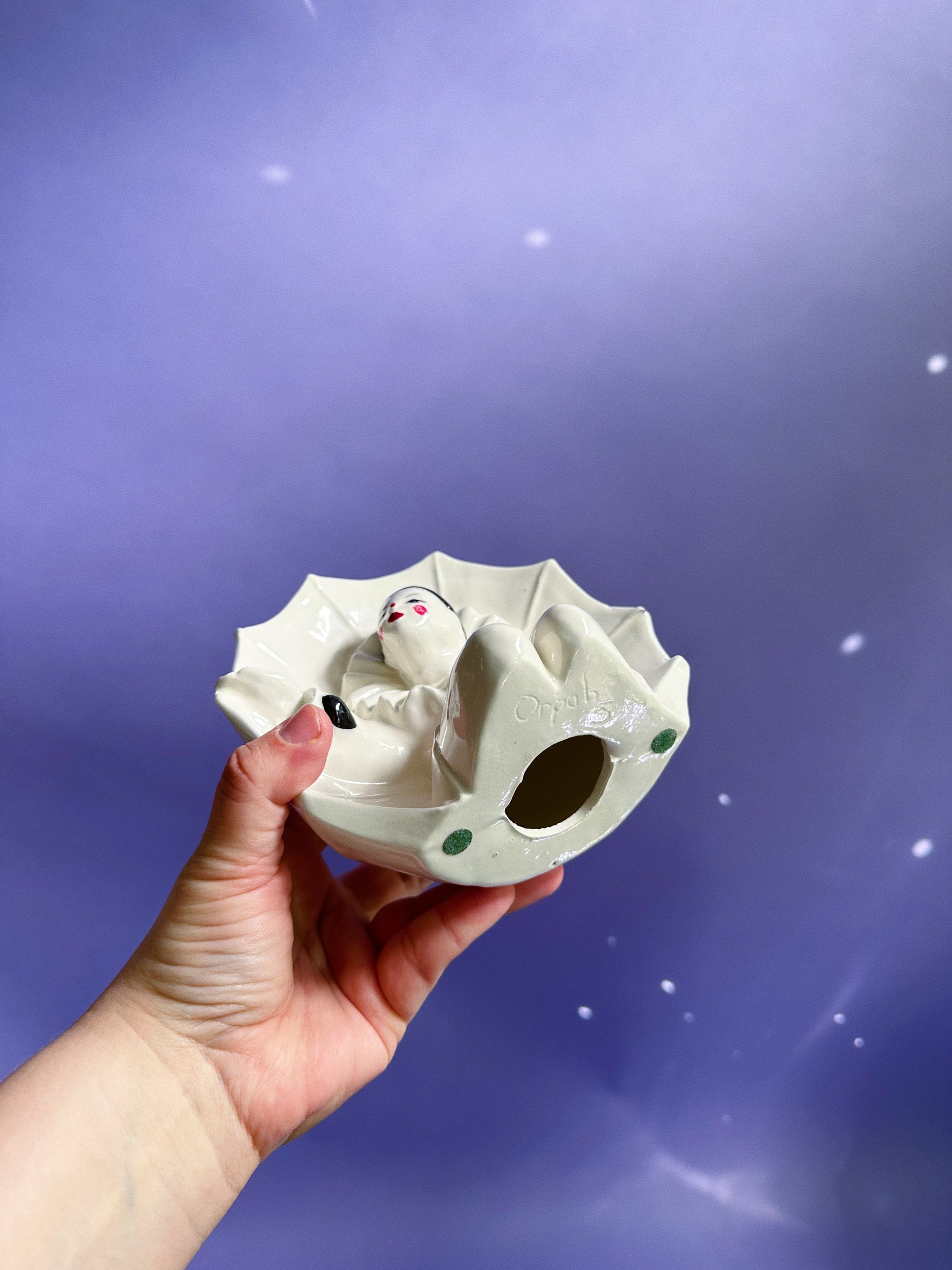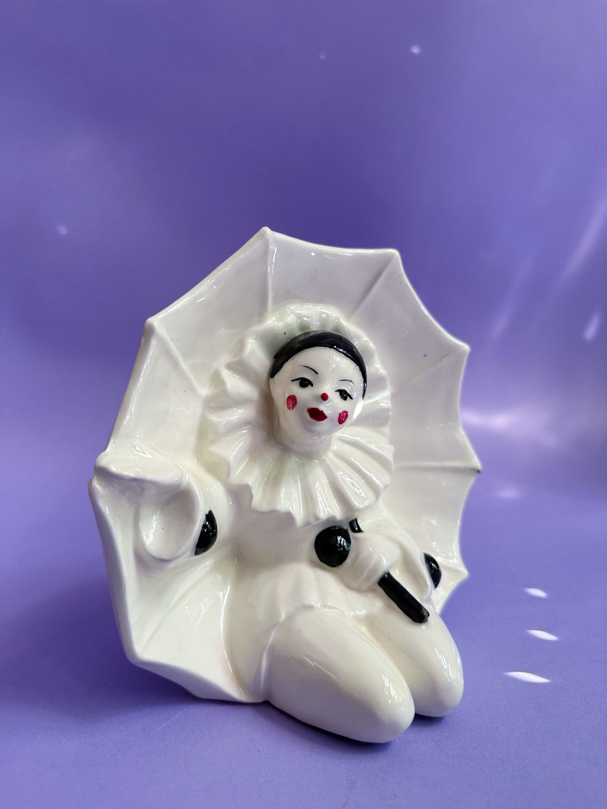Vintage Porcelain Pierrot Clown Figurine Holding Umbrella Handpainted