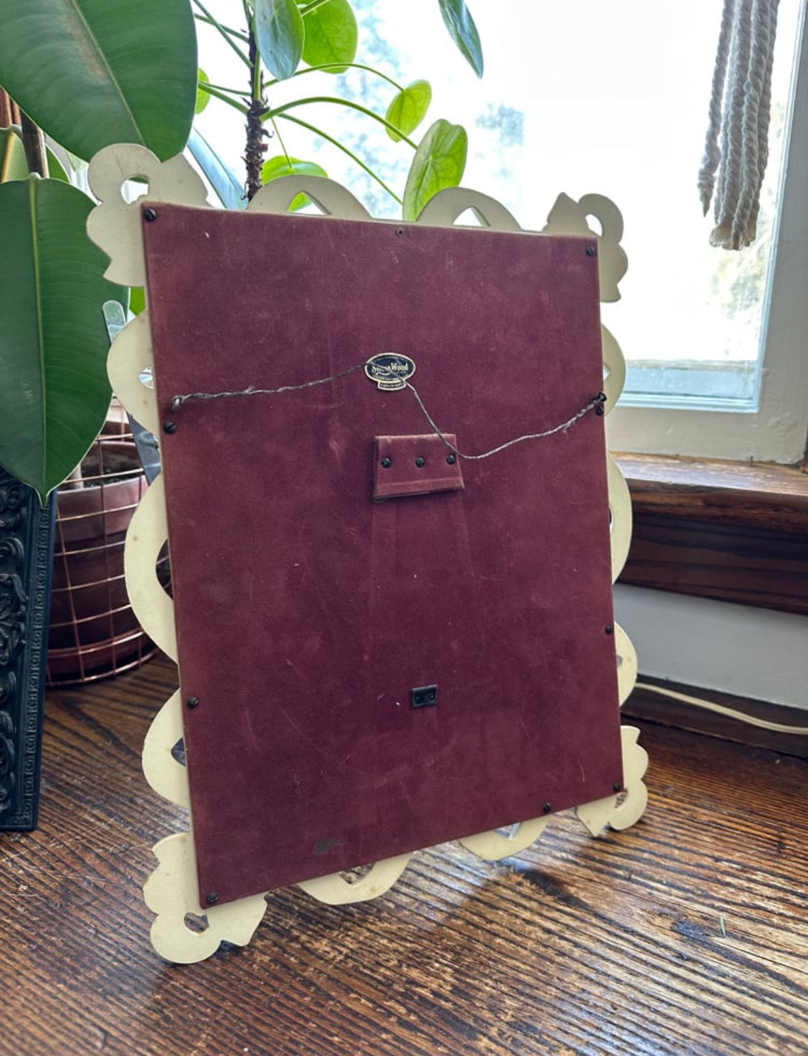 Beautiful bows on the corner. Used to have a stand but can be leaned if you’d like to use as a vanity mirror. Otherwise it has wire to be hung.