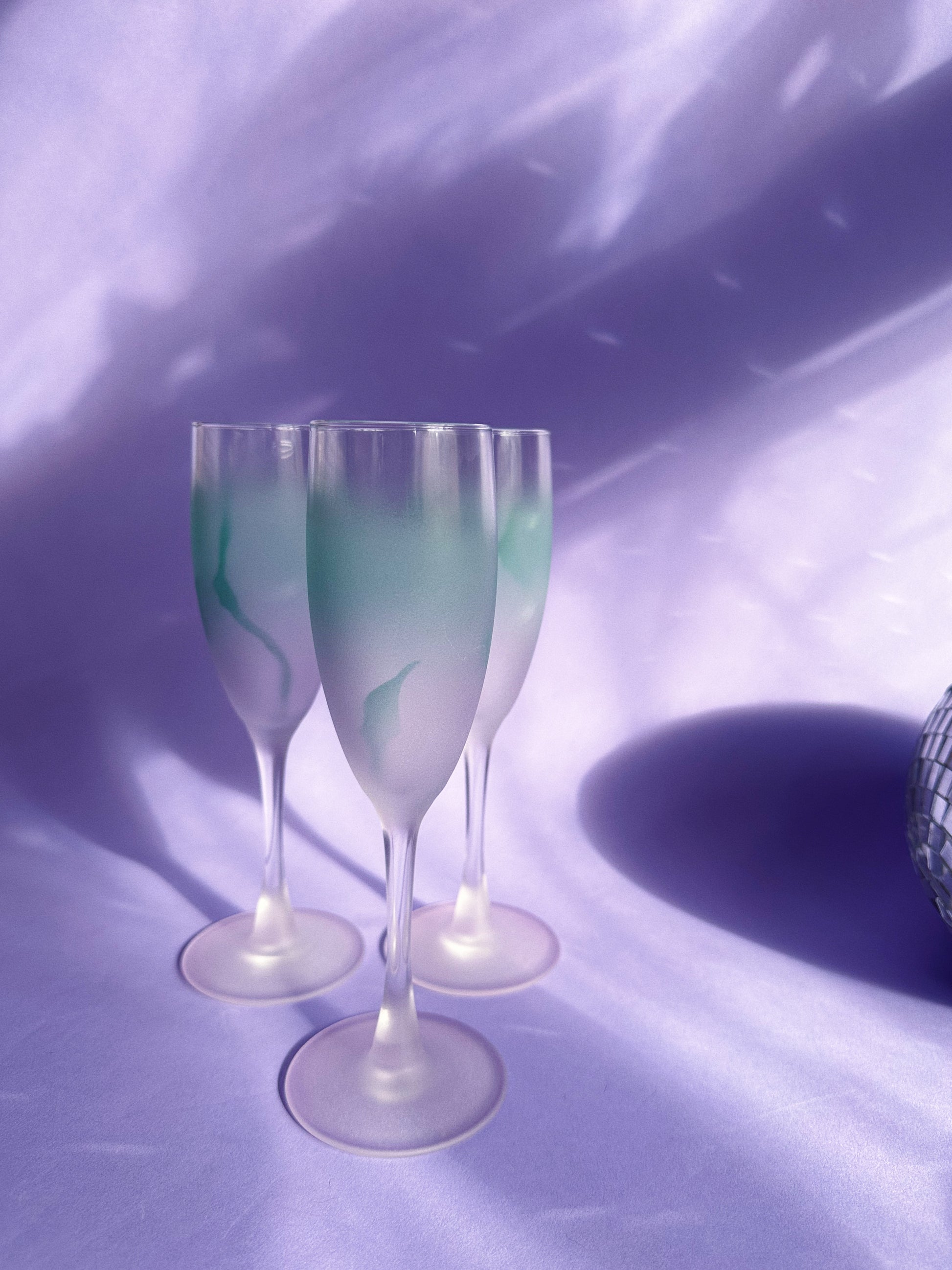 Vintage Teal & Purple Frosted Watercolour Luminarc France Champagne Flutes