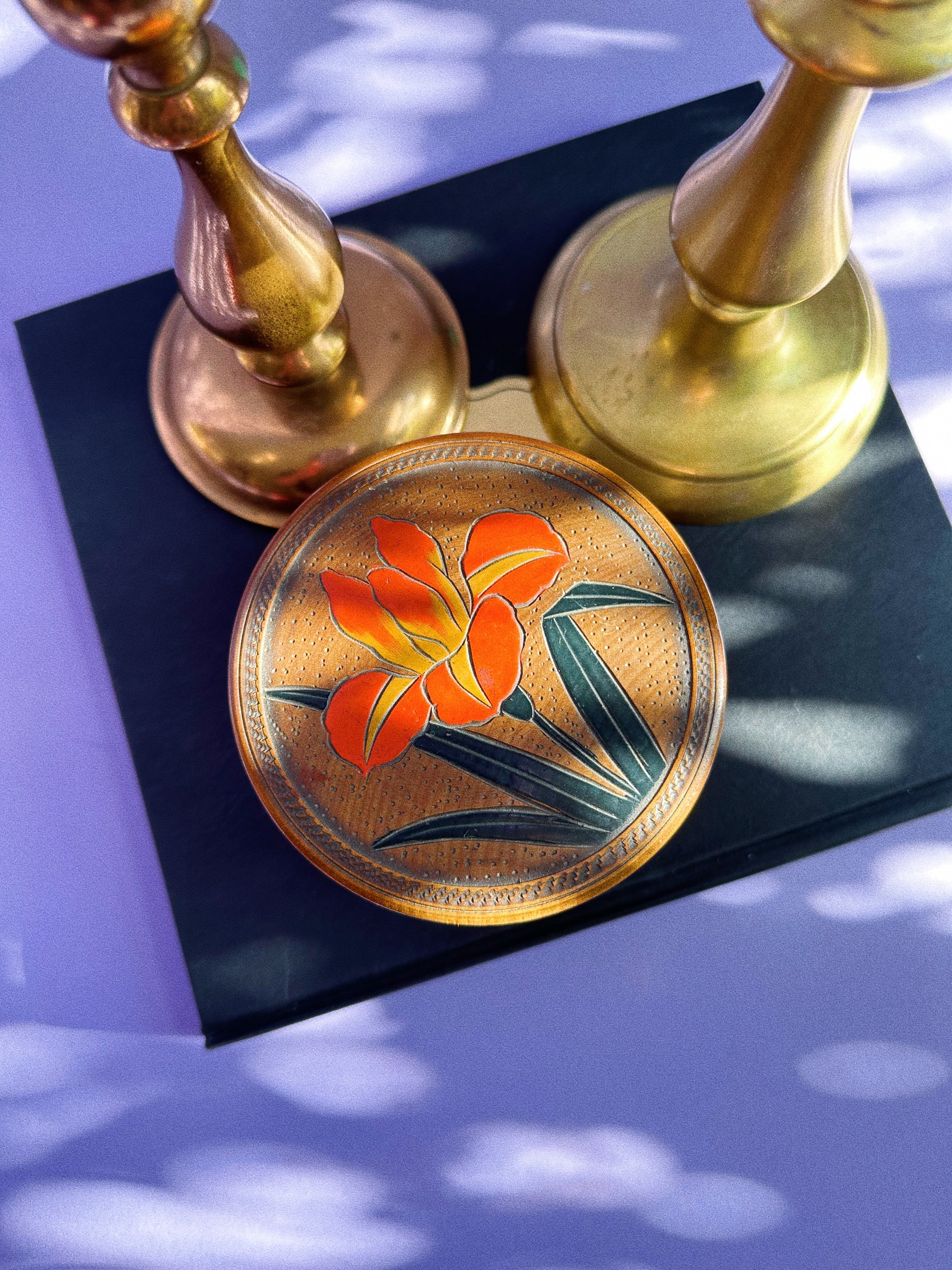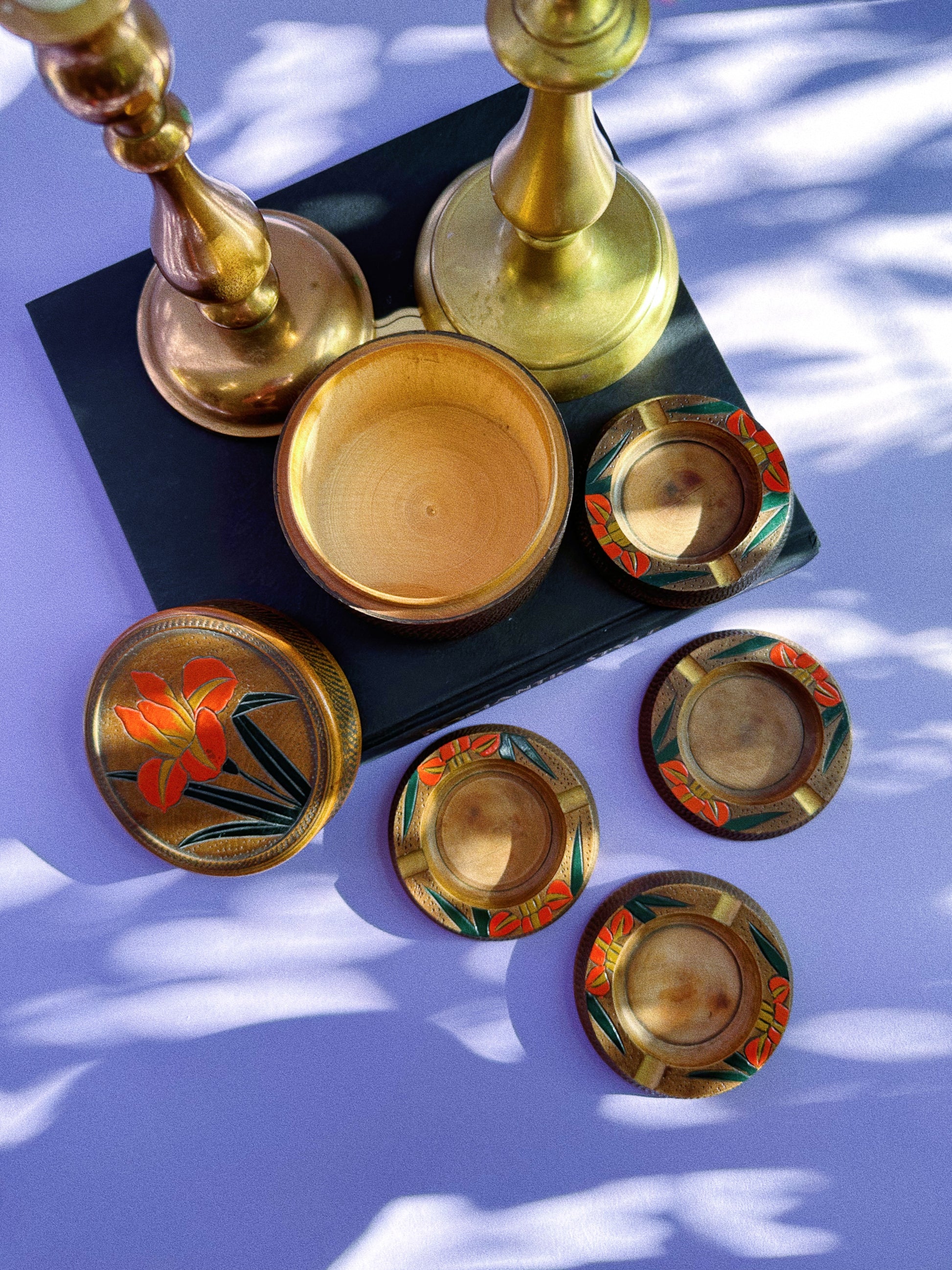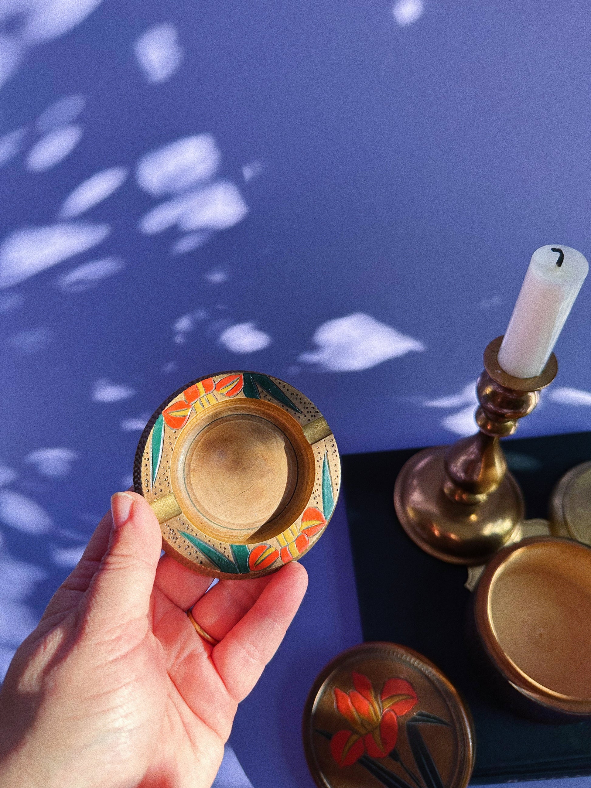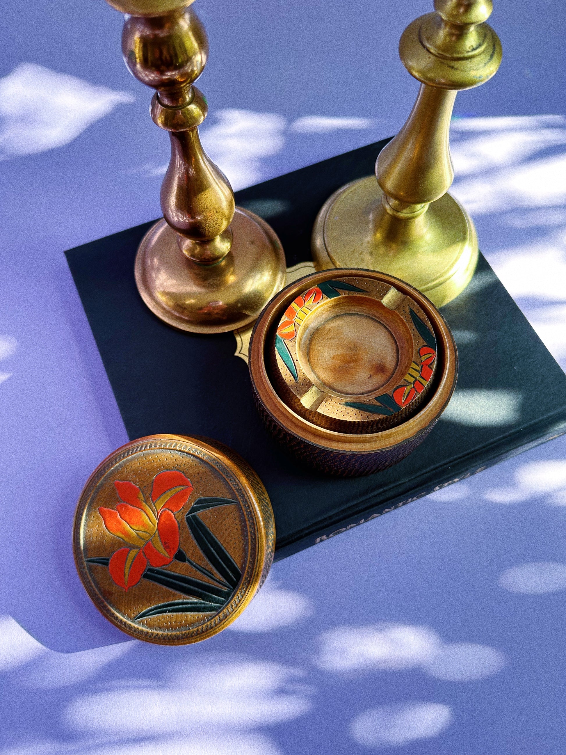 Vintage Wood Tulip Ashtray Set Lidded Box