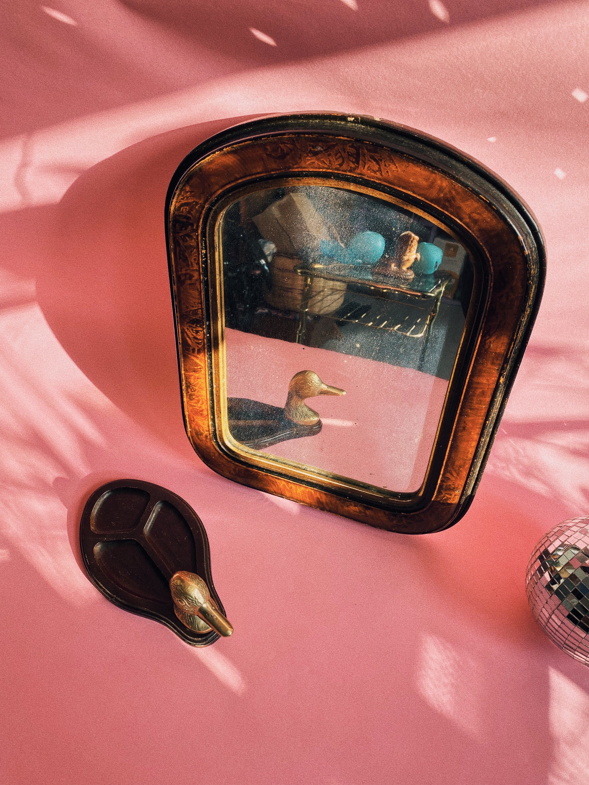 The mirror has a lot of wear on it but still useable and gives an even more vintage feel.